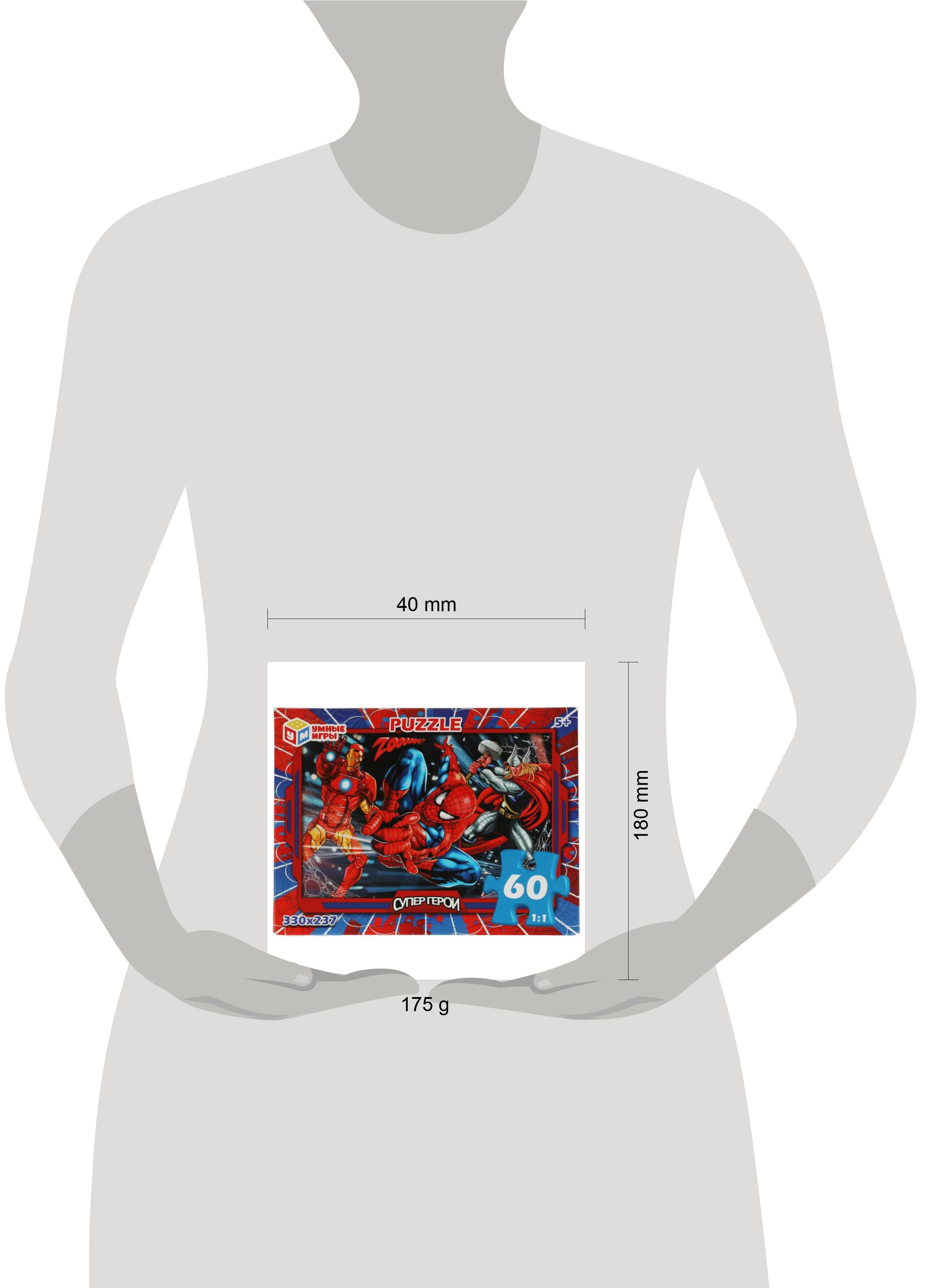 Аннотация: Пазлы. Супергерои. 60 деталей. 190х141х35мм. Умные игры в кор.24шт