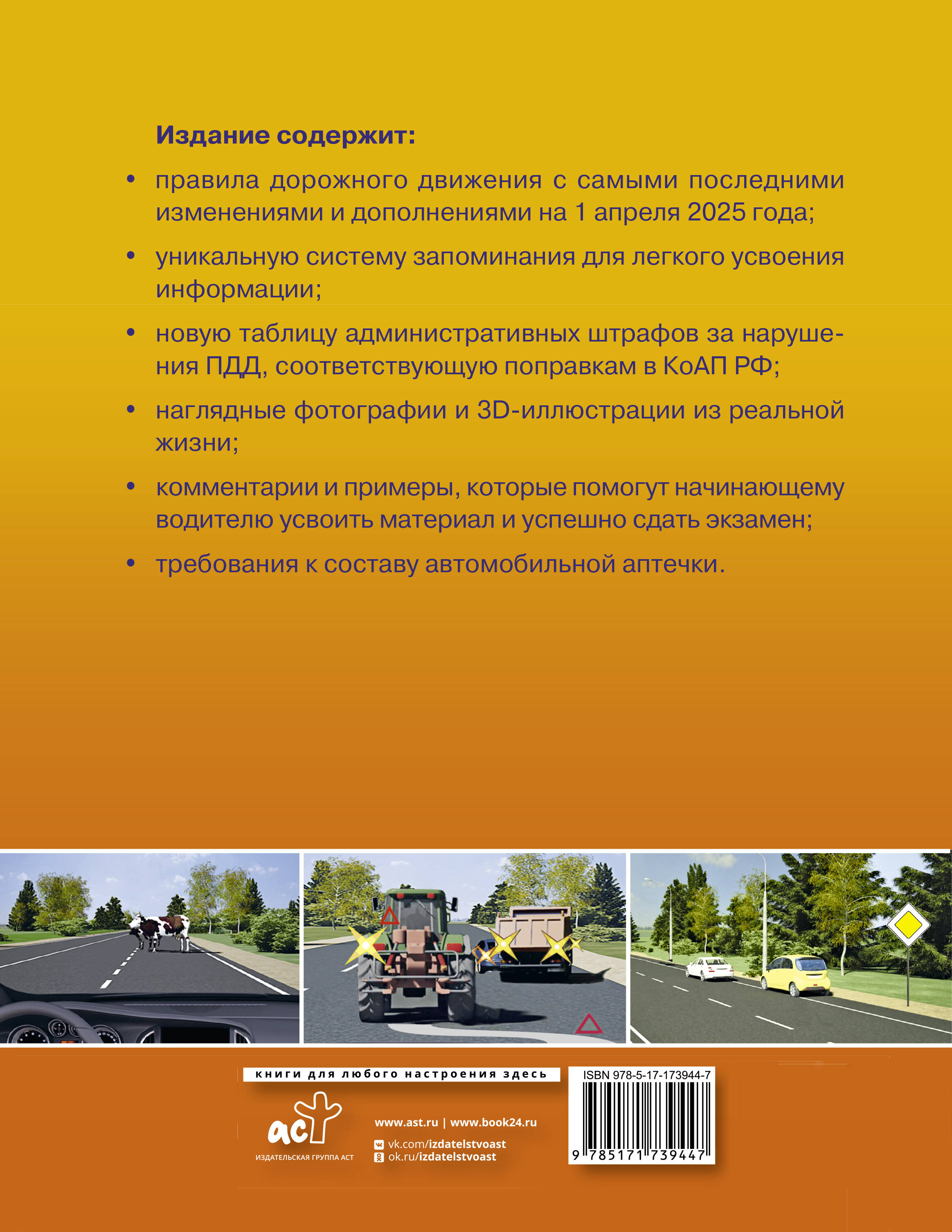Издание содержит: - правила дорожного движения с самыми последними изменениями и дополнениями на 1 апреля 2025 года; - уникальную систему запоминания для легкого усвоения информации; - новую таблицу административных штрафов за нарушения ПДД, соответствующую поправкам в КоАП РФ; - наглядные фотографии и 3D-иллюстрации из реальной жизни; - комментарии и примеры, которые помогут начинающему водителю усвоить материал и успешно сдать экзамен; - перечень неисправностей и условий, при которых запрещается эксплуатация транспортных средств; - требования к составу автомобильной аптечки. Издание учитывает все изменения, опубликованные в официальных источниках на момент подписания издания в печать.| Издательство | Издательство "АСТ" |