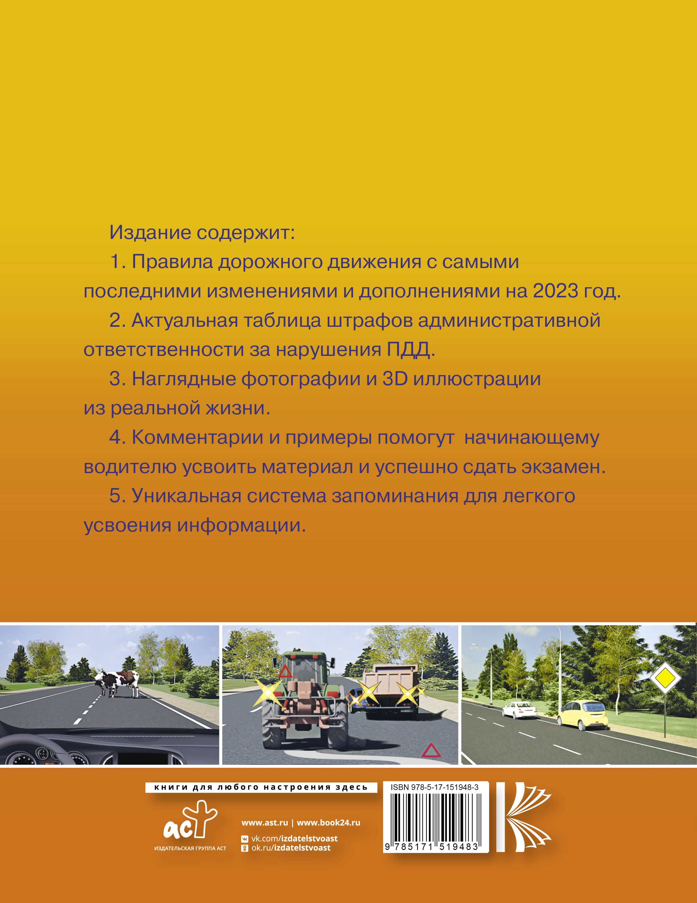 Издание содержит: 1. Правила дорожного движения с самыми последними изменениями и дополнениями на 2023 год. 2. Актуальная таблица штрафов административной ответственности за нарушения ПДД. 3. Наглядные фотографии и 3D иллюстрации из реальной жизни. 4. Комментарии и примеры помогут начинающему водителю усвоить материал и успешно сдать экзамен. 5. Уникальная система запоминания для легкого усвоения информации.| Издательство | ИЗДАТЕЛЬСТВО "АСТ" |