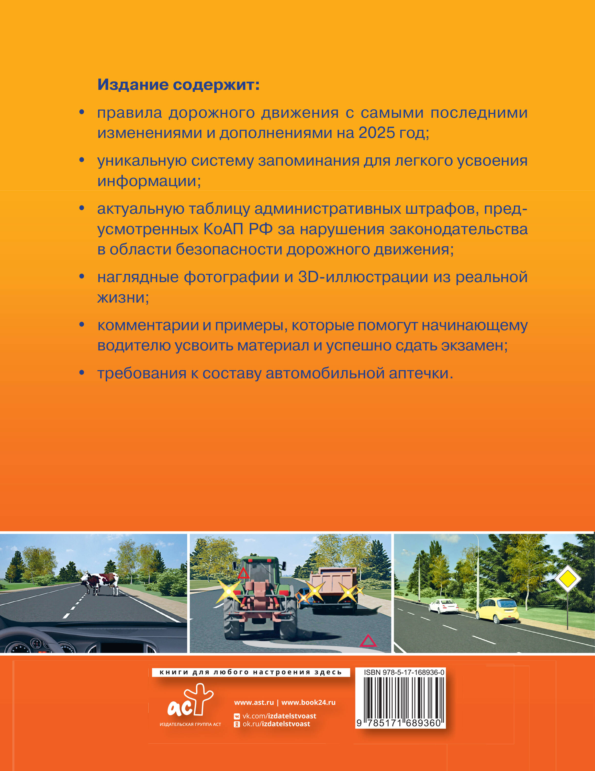 Издание содержит: - правила дорожного движения с самыми последними изменениями и дополнениями на 2025 год; - уникальную систему запоминания для легкого усвоения информации; - актуальную таблицу административных штрафов, предусмотренных КоАП РФ за нарушения законодательства в области безопасности дорожного движения; - наглядные фотографии и 3D-иллюстрации из реальной жизни; - комментарии и примеры, которые помогут начинающему водителю усвоить материал и успешно сдать экзамен; - расширенный Перечень неисправностей и условий, при которых запрещается эксплуатация транспортных средств; - требования к составу автомобильной аптечки. Издание учитывает все изменения, опубликованные в официальных источниках на момент подписания издания в печать.| Издательство | Издательство "АСТ" |