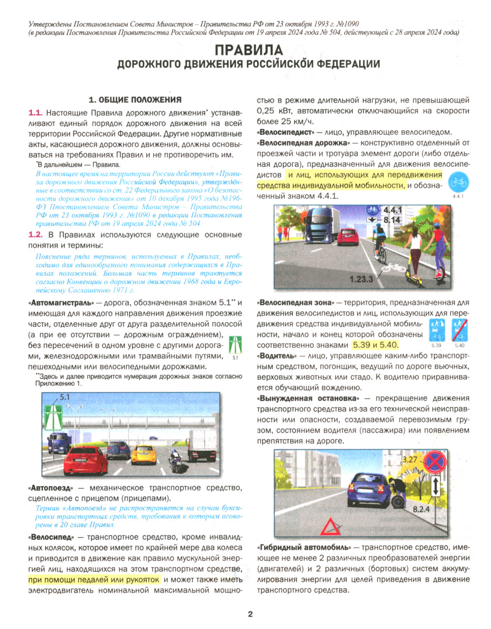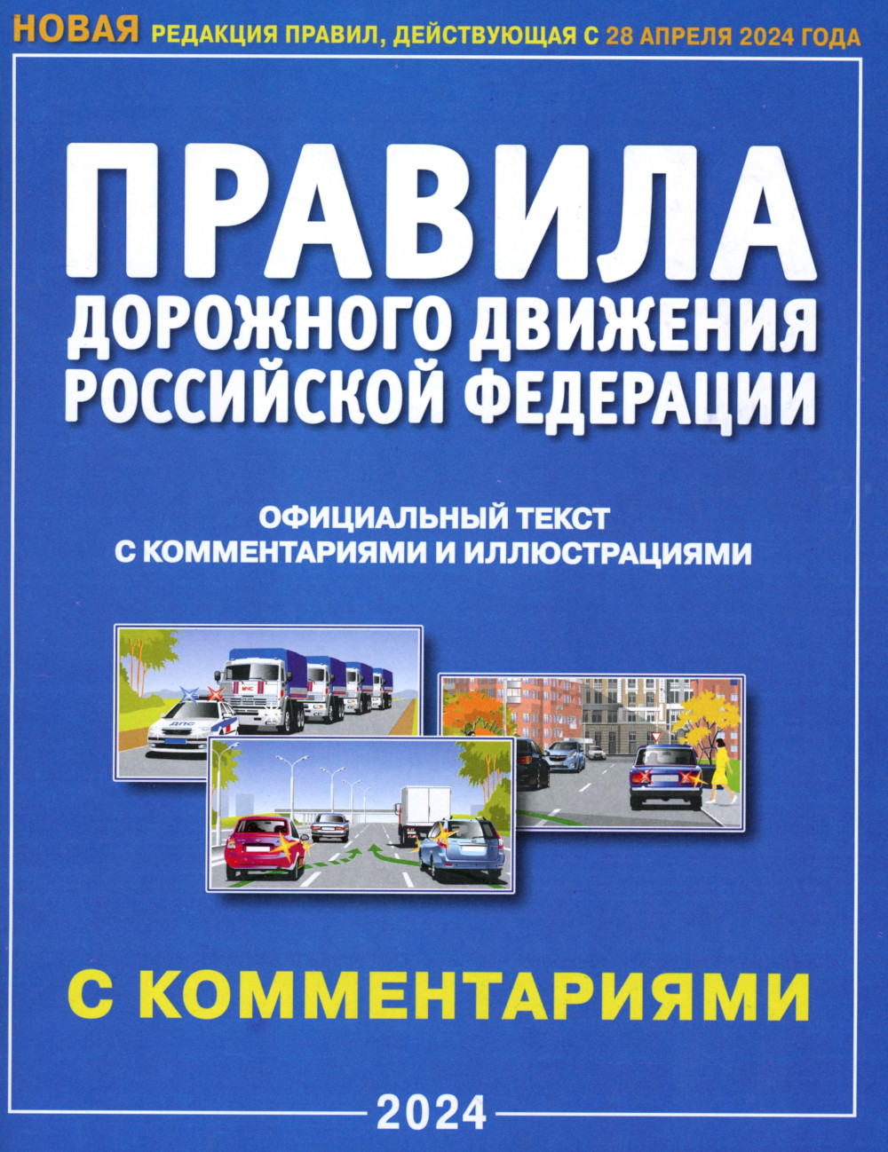 В издании опубликован текст Правил дорожного движения Российской Федерации, утверждённых постановлением Совета Министров -Правительства Российской Федерации от 23 октября 1993 года №1090, в редакции постановления Правительства Российской Федерации от 19 апреля 2024 года №504, срок действия которой данным постановлением установлен с 28 апреля 2024 года по 01 марта 2029 года. Изменения, вносимые данным постановление в Правила дорожного движения, выделены в тексте синим фоном. Также в тексте выделены: желтым фоном - изменения, внесённые постановлением от 06 октября 2022 года №1769; розовым - постановлением от 27 мая 2023 года №837, зелёным - постановлением от 02 июня 2023 года №908. Отдельные пункты Правил снабжены комментариями редакции, выделенными голубым цветом, а также иллюстрациями. В тексте Правил редакцией размещены выделенные зелёным цветом ссылки на ряд статей Кодекса Российской Федерации об административных правонарушениях, регламентирующих ответсвенность участников дорожного движения за нарушение соответствующих положений Правил. В конце издания редакцией размещена таблица с подборкой статей Кодекса Российской Федерации об административных правонарушениях, регламентирующих ответсвенность участников дорожного движения за нарушение Правил дорожного движения, в редакции Федерального закона от 14 июля 2022 года 257-ФЗ. Издание подготовлено при информационной поддержке Отдела нормативно-правового регулирования и внешнего взаимодействия ГУО БДД МВД России.| Издательство | Атберг 98 |
