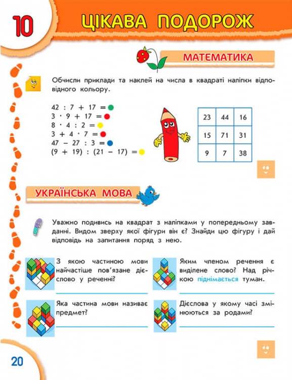 "Підручник для відмінника. 4 клас" - цікаві вправи на весь рік! «Підручник для відмінника. 4 клас» допоможе вашій дитині повторити і вивчити найактуальніші теми молодшої школи. У посібнику передбачено 4 типи завдань. Їх можна виконувати кольоровими олівцями, ручкою, за допомогою наліпок (йдуть в комплекті з книгою), завдання квест вимагають особливої уважності і кмітливості. У 4 класі на уроках української мови вивчають лексичне значення слів, будову слова, роди та відмінки іменника і прикметника. Всі ці теми і багато інших знайшли своє відображення на сторінках посібника.Таблиця множення, дроби, рівняння, правила множення і ділення в стовпчик разом з оригінальними і цікавими завданнями стануть набагато простіше і доступніше для кожного школяра. Малюючи і наклеюючи наліпки, четвертокласник вивчить і повторить ці важливі теми. Уроки англійської мови 4 клас включають в себе вивчення питальних речень, множини іменників, позначення часу, освоєння нового лексичного матеріалу. У завданнях з природознавства представлені відомості про космос і планети, національні традиції України, лікарські рослини і рідкісних тварин. У книзі дано 480 наліпок, які використовуються при рішенні завдань! Підручник, як і належить, має відповіді на всі завдання. Але наша книга настільки незвичайна, що в ній відповіді розміщені не на останній сторінці, а в середині. Це надає можливість батькам вийняти сторінки з відповідями, щоб позбавити малечу бажання піддивлятися. Отже, цікаві та різноманітні вправи "Підручника для відмінника" допоможуть учню: міцно засвоїти та закріпити шкільну програму розвинути пам'ять, увагу, логіку та дрібну моторику перетворити навчання у цікаву та захоплюючу гру! Разом сприяємо успіху дітей і пишаємось тим, що наші учні в майбутньому стануть найрозумнішими та творчими особистостями! Також за допомогою наданих наліпок-смайликів можна оцінити результат своєї праці!| ISBN | 978-966-262-360-4 |
