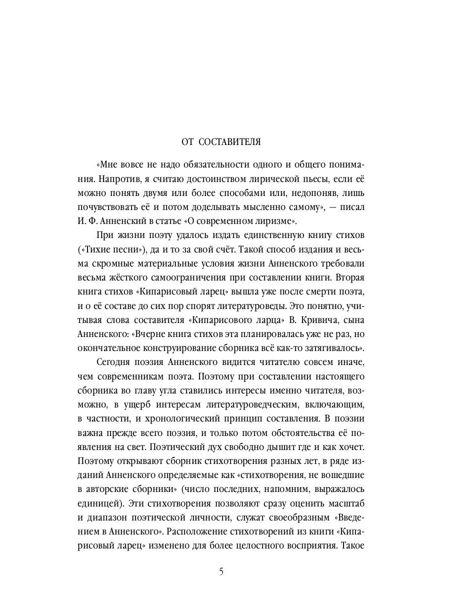 Настоящее издание знакомит читателя с лирическим наследием И. Ф. Анненского (1855-1909), одного из наиболее значимых и утонченных поэтов Серебряного века. Судьба Анненского-поэта сложилась не слишком удачно: директор Царскосельской гимназии, автор книг по словесности и педагогике и переводов античных авторов, он был немногим известен в своем литературном амплуа, лишь в конце жизни издал единственный сборник стихов «Тихие песни» (1904; под псевдонимом «Ник. Т-о»). Между тем лирика Анненского, музыкально изысканная, образно тонкая, философски насыщенная, будила живой отклик у Блока и Маяковского; по мнению целого ряда исследователей, она оказала огромное влияние на последующее, «постсимволистское» развитие русской поэзии, включая Г. Иванова, А. Ахматову, Б. Пастернака. Творчество поэта представлено в книге его избранными стихотворениями. Дополняют издание переводы Анненского из западноевропейских классиков и модернистов, а также его вакхическая драма «Фамира-кифарэд» (1906).| Издательство | Т8 RUGRAM |