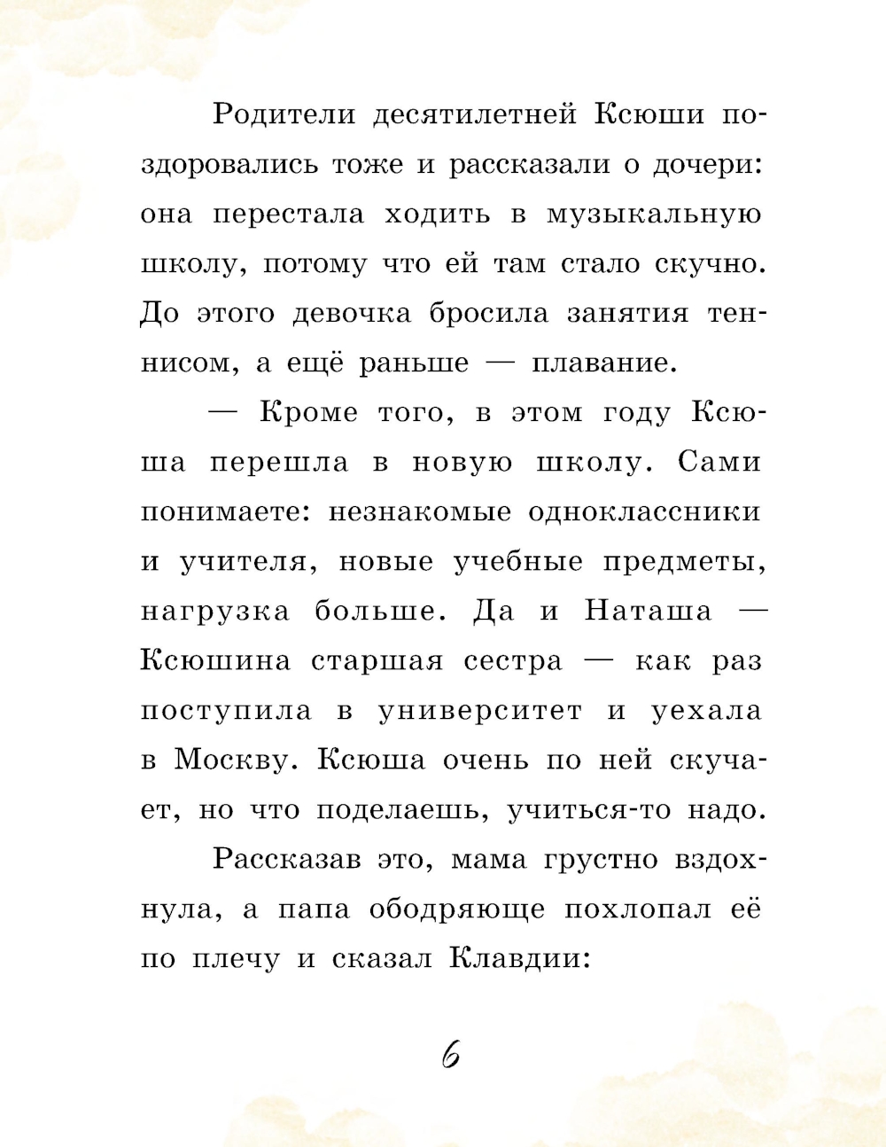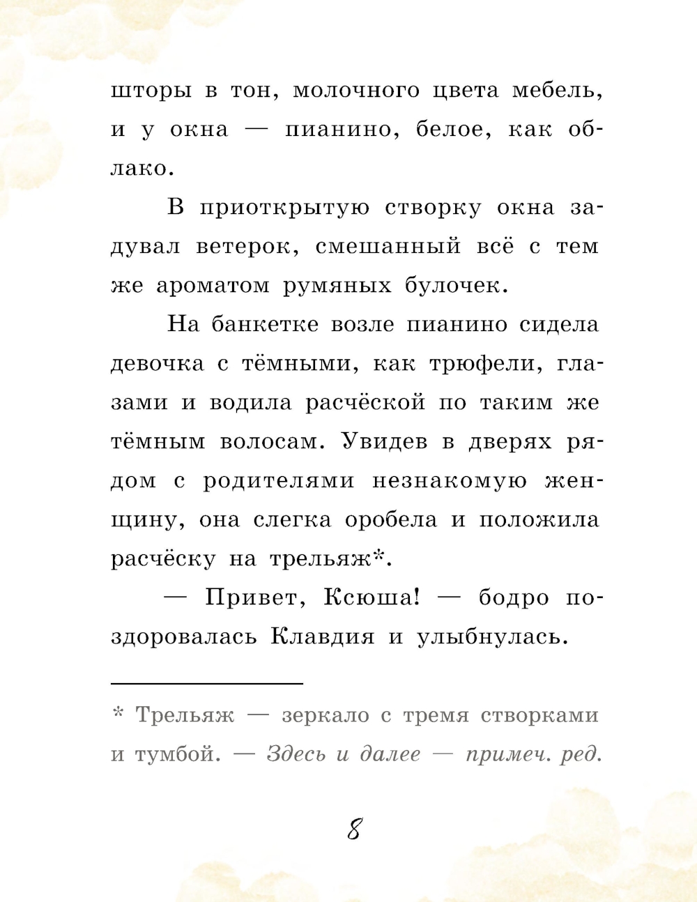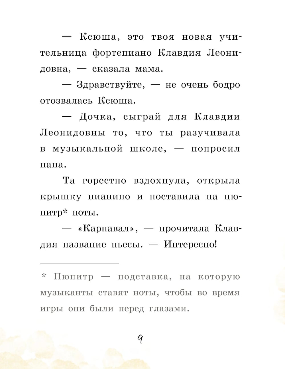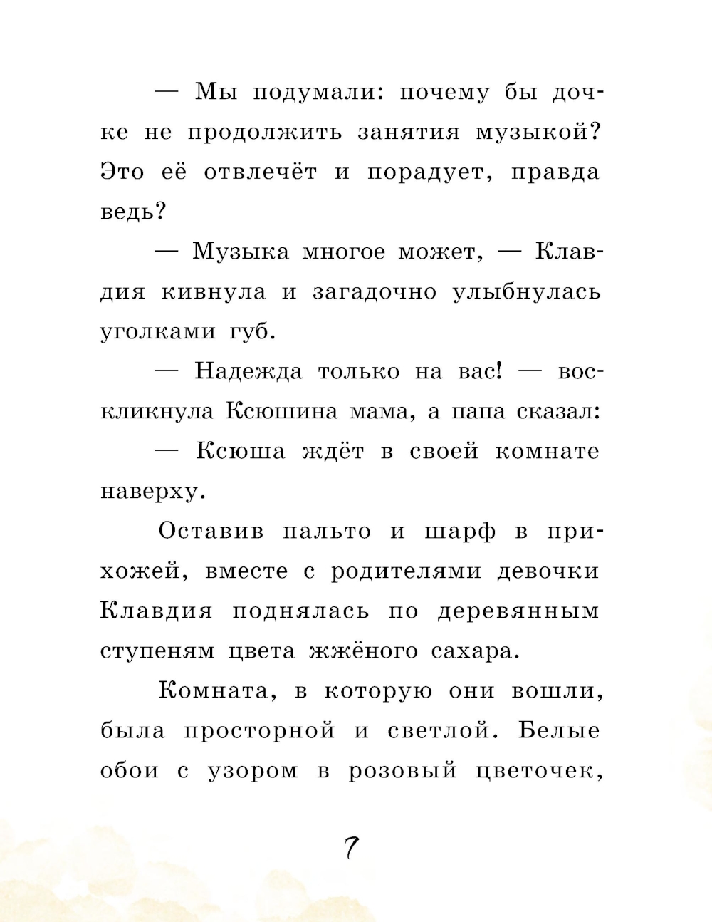 Счастье, когда в жизни ребёнка появляется своя Мэри Поппинс! Ксюше повезло: Клавдия Леонидовна, её новая учительница музыки, именно такая волшебница. С ней игра на фортепиано из скучного разучивания гамм превращается в увлекательное приключение: прямо в комнате разворачиваются бал-маскарад и кукольный театр, а мелодии сочиняются по щелчку. И как здорово, что для этого требуются только два секретных ингредиента - фантазия и любовь!| Издательство | Пять четвертей |
