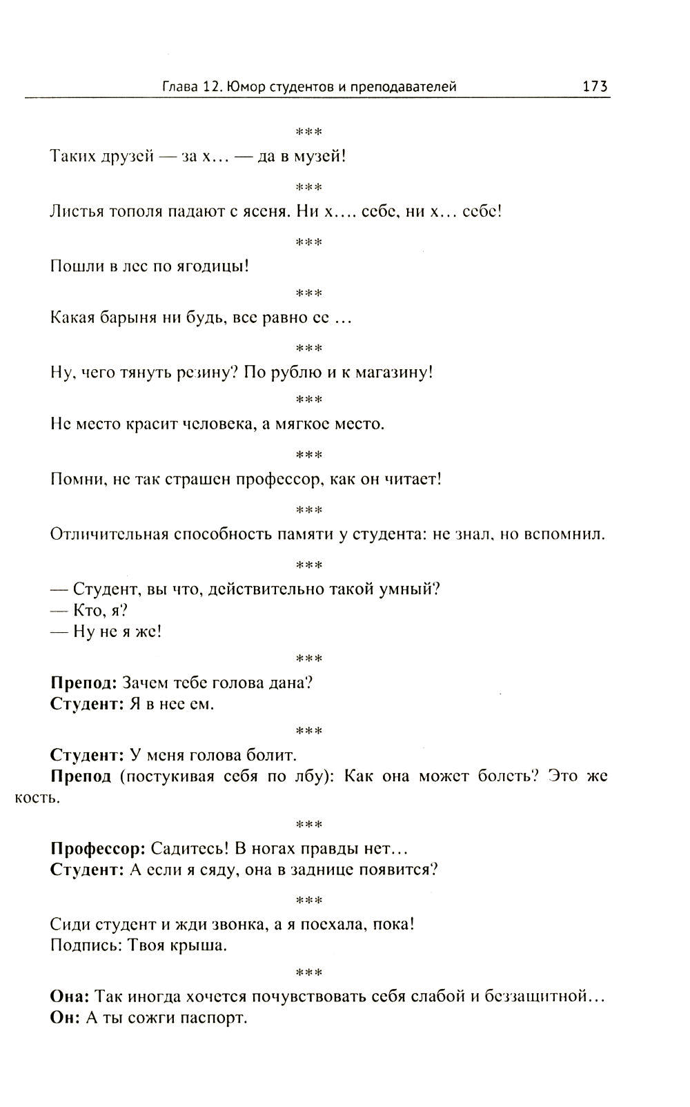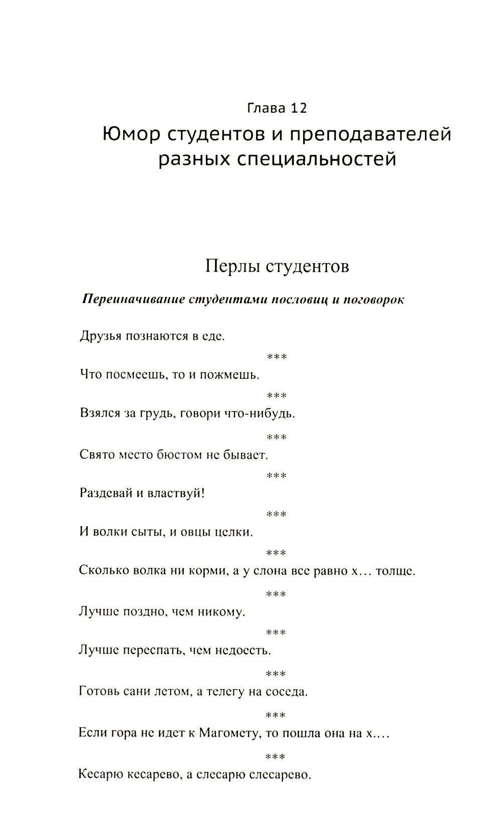 В книге впервые объединились педагоги, ученые и студенты самых разных специальностей: физики, математики, инженеры, химики, геологи, биологи, медики, экономисты, историки, филологи, философы и др. В аудиториях, лабораториях, на полевых работах и военных сборах, рассуждая в беседах или в одиночку, они выдают неожиданные перлы, пуская стрелы вольного или невольного остроумия, рождая глубокомысленные афоризмы и «ляпы», передаваемые затем из уст в уста, входящие в память поколений. Книга продолжает и значительно расширяет поле юмора, «вспахиваемое» популярными изданиями: «Советские физики шутят... Хотя бывало не до шуток» (URSS), «Математики тоже шутят» (URSS), «Химики еще шутят» (URSS), «Геологи шутят... И не шутят» (URSS), «Ученые шутят» (URSS), «Физики продолжают шутить» (URSS). Как говорил великий Ландау: «Самый страшный грех - это скучать. Анекдоты полезны, потому что полезно смеяться». Книга предназначена учителям, учащимся, ученым самых разных специальностей. Большинство шуток, забавных и необычных историй, приведенных в ней, будет понятно и неспециалисту. Поэтому эту веселую книгу можно предложить всем ценителям юмора.| Издательство | ЛЕНАНД |