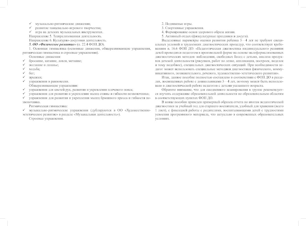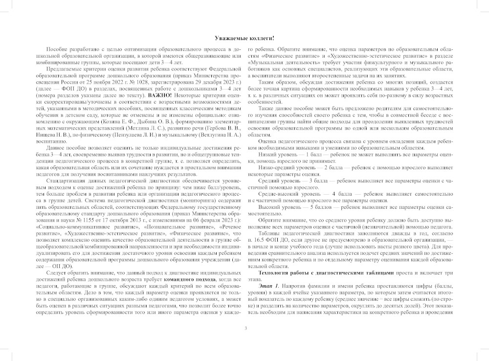 Предлагаемое практическое пособие разработано с целью оптимизации образовательного процесса в дошкольной образовательной организации с общеразвивающими или комбинированными группами, которые посещают дети 3-4 лет, и содержит параметры для оценки развития ребенка по пяти образовательным областям согласно ФГОС ДО. Предлагаемые критерии оценки развития ребенка соответствуют Федеральной образовательной программе дошкольного образования (приказ Министерства просвещения России от 25 ноября 2022 г. № 1028, зарегистрирована 29 декабря 2023 г.) (ФОП ДО) в разделах, посвященных работе с дошкольниками 3-4 лет. Уровневая оценка позволяет не только оценить индивидуальные особенности развития ребенка, но и определить успешность реализации педагогического процесса в группах для детей 3-4 лет. Командный подход не требует разработки отдельных диагностических подходов от педагогов группы (воспитателя, музыкального руководителя, инструктора по физкультуре), так как данное пособие обеспечивает их диагностическими таблицами в комплексном варианте по всем пяти образовательным областям. В конце пособия приведен примерный образец отчета по итогам педагогической диагностики за учебный год для старшего воспитателя, удобный для хранения (всего 1 лист), с фиксацией работы с родителями, воспитывающими детей с трудностями усвоения программного материала, что актуально в современных образовательных условиях. Пособие адресовано педагогам дошкольных образовательных учреждений (воспитателям, музыкальным руководителям и физкультурным работникам), заведующим и заместителям заведующих по ОВР, старшим воспитателям. Пособие может быть интересно родителям для оценки развития своего ребенка 3-4 лет, а также студентам, обучающимся по направлению «Педагогические науки», профиль «Дошкольное образование».| Издательство | Детство-Пресс |