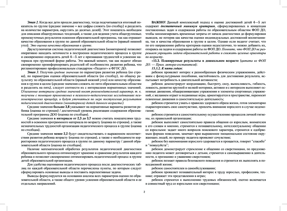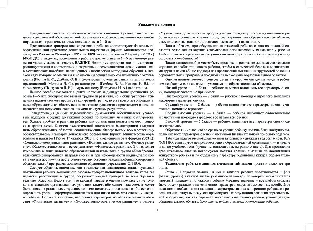 Предлагаемое практическое пособие разработано с целью оптимизации образовательного процесса в дошкольной образовательной организации с общеразвивающими или комбинированными группами, которые посещают дети 4-5 лет, и содержит параметры для оценки развития ребенка по пяти образовательным областям согласно ФГОС ДО. Предлагаемые критерии оценки развития ребенка соответствуют Федеральной образовательной программе дошкольного образования (приказ Министерства просвещения России от 25 ноября 2022 г. № 1028, зарегистрирована 29 декабря 2023 г.) (ФОП ДО) в разделах, посвященных работе с дошкольниками 4-5 лет. Уровневая оценка позволяет не только оценить индивидуальные особенности развития ребенка, но и определить успешность реализации педагогического процесса в группах для детей 4-5 лет. Командный подход не требует разработки отдельных диагностических подходов от педагогов группы (воспитателя, музыкального руководителя, инструктора по физкультуре), т. к. данное пособие обеспечивает их диагностическими таблицами в комплексном варианте по всем пяти образовательным областям. В конце пособия приведен примерный образец отчета по итогам педагогической диагностики за учебный год для старшего воспитателя, удобный для хранения (всего 1 лист), с фиксацией работы с родителями , воспитывающими детей с трудностями усвоения программного материала, что актуально в современных образовательных условиях. Издание адресовано педагогам дошкольных образовательных учреждений (воспитателям, музыкальным руководителям и физкультурным работникам), заведующим и заместителям заведующих по ОВР, старшим воспитателям. Пособие может быть интересно родителям для оценки развития своего 4-5-летнего ребенка, а также студентам, обучающимся по направлению «Педагогические науки», профиль «Дошкольное образование».