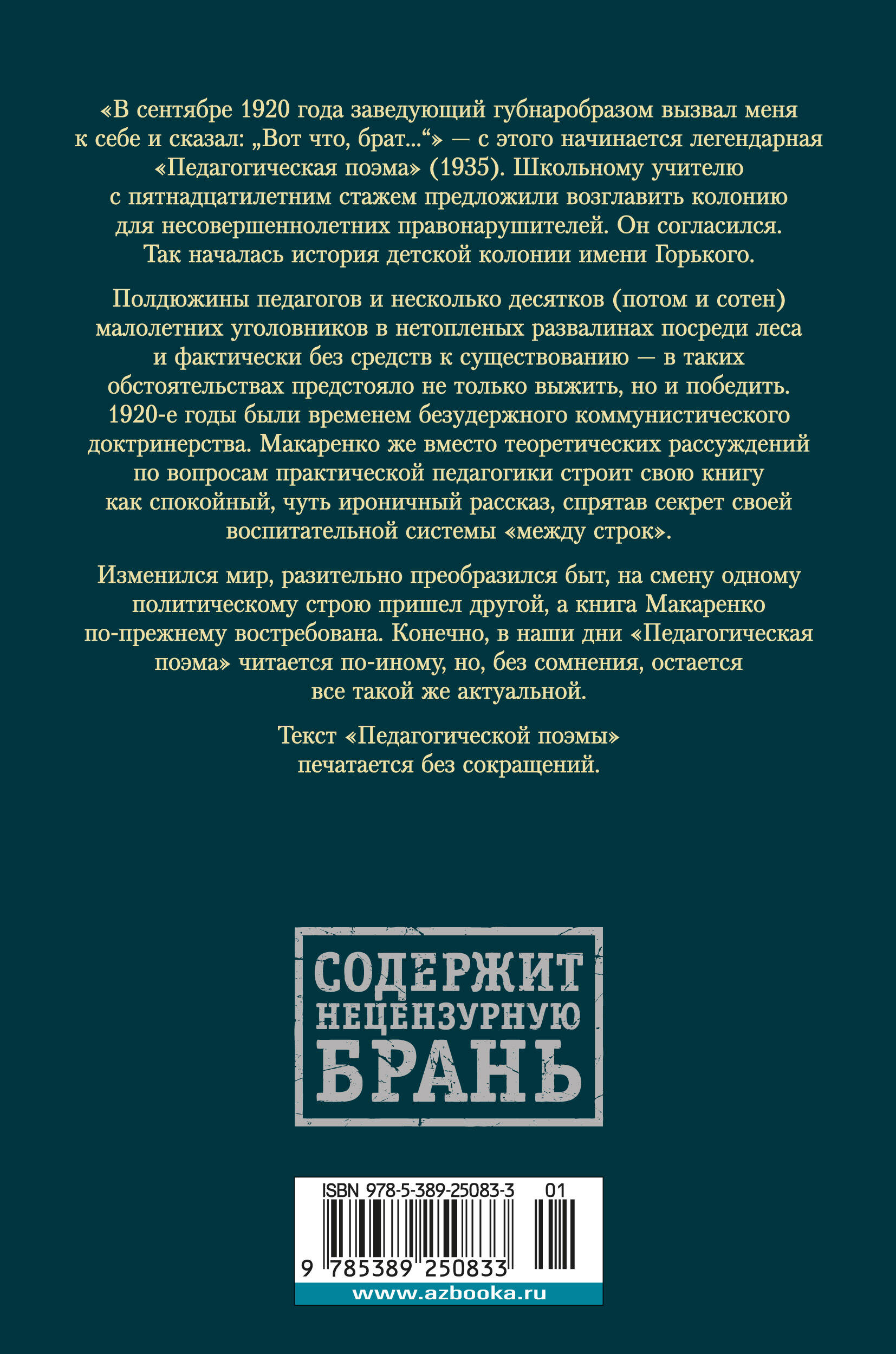 Имя А. С. Макаренко стало одним из символов советской эпохи, а его произведения в те годы были самыми популярными работами по воспитанию молодежи. Изменился мир, разительно преобразился быт, на смену одному политическому строю пришел другой, а сочинения Макаренко остаются все так же востребованы, как и прежде. "В сентябре 1920 года заведующий губнаробразом вызвал меня к себе и сказал: "Вот что, брат..."" - с этого начинается легендарная "Педагогическая поэма" (1935). Школьному учителю предложили возглавить колонию для несовершеннолетних правонарушителей. Он согласился. Так началась история детской колонии имени Горького. Макаренко строит свою книгу как спокойный, чуть ироничный рассказ, спрятав секрет своей воспитательной системы "между строк". Текст "Педагогической поэмы" печатается без сокращений.| Издательство | Азбука-Аттикус Издат.группа ООО |