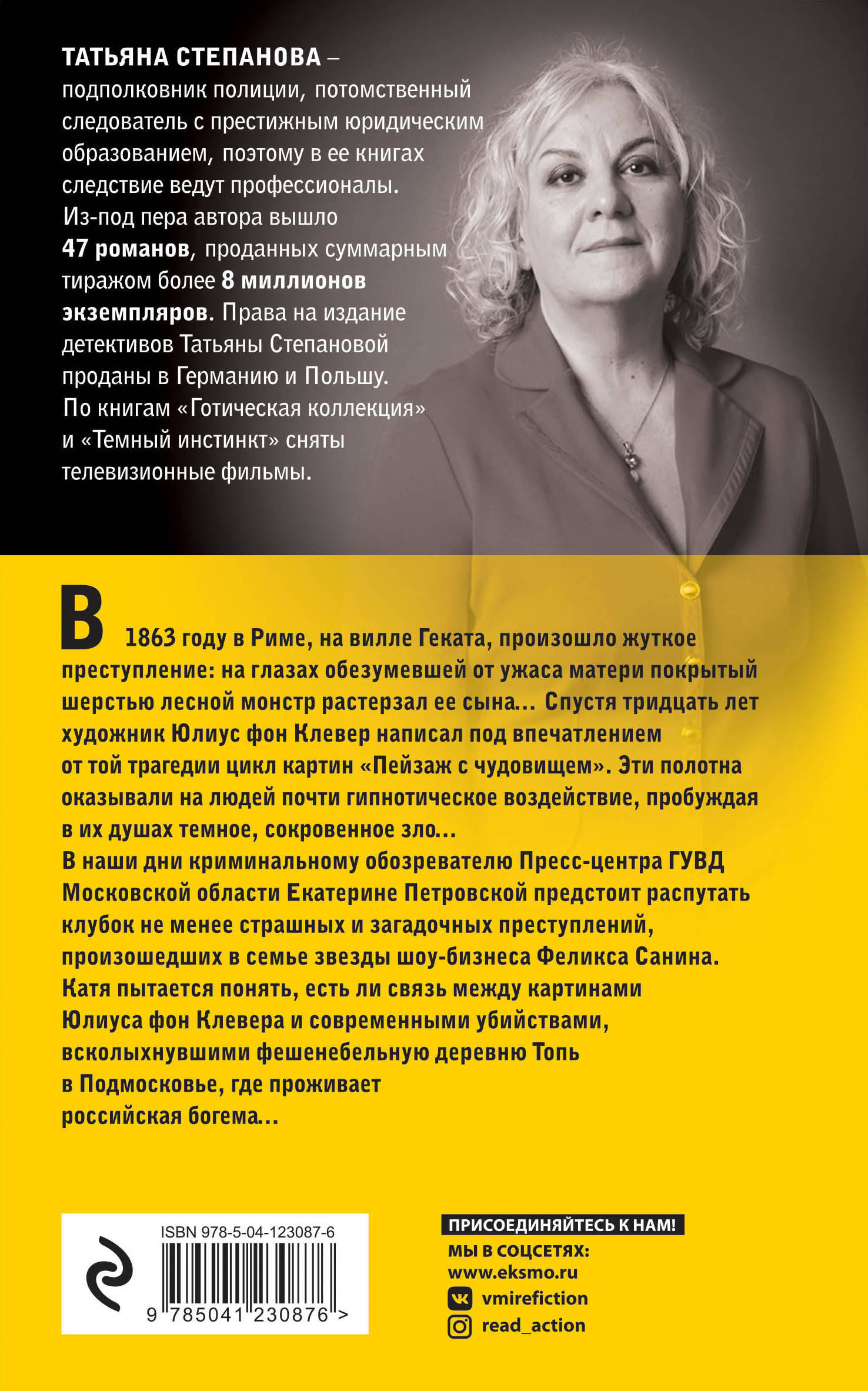 В 1863 году в Риме, на вилле Геката, произошло жуткое преступление: на глазах обезумевшей от ужаса матери покрытый шерстью лесной монстр растерзал ее сына… Спустя тридцать лет художник Юлиус фон Клевер написал под впечатлением от той трагедии цикл картин «Пейзаж с чудовищем». Эти полотна оказывали на людей почти гипнотическое воздействие, пробуждая в их душах темное, сокровенное зло… В наши дни криминальному обозревателю Пресс-центра ГУВД Московской области Екатерине Петровской предстоит распутать клубок не менее страшных и загадочных преступлений, произошедших в семье звезды шоу-бизнеса Феликса Санина. Катя пытается понять, есть ли связь между картинами Юлиуса фон Клевера и современными убийствами, всколыхнувшими фешенебельную деревню Топь в Подмосковье, где проживает российская богема… Романы потомственного следователя Татьяны Степановой позволяют читателю побывать в литературной «комнате страха». Таинственные убийства, почти осязаемая атмосфера преступления, томительное и тревожное ожидание чего-то неведомого, пугающего... Все это Татьяне Степановой удается воспроизвести просто блестяще. Случайные встречи, повседневные дела, незначительные детали изображаются в ее детективах в каком-то особом, драматическом свете, словно безобидный весенний луг перед стремительно надвигающейся грозой.| Издательство | ООО "Издательство "Эксмо" |