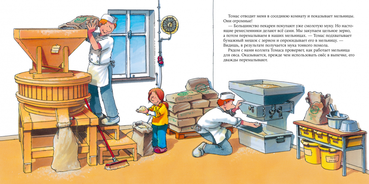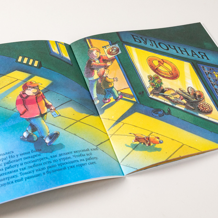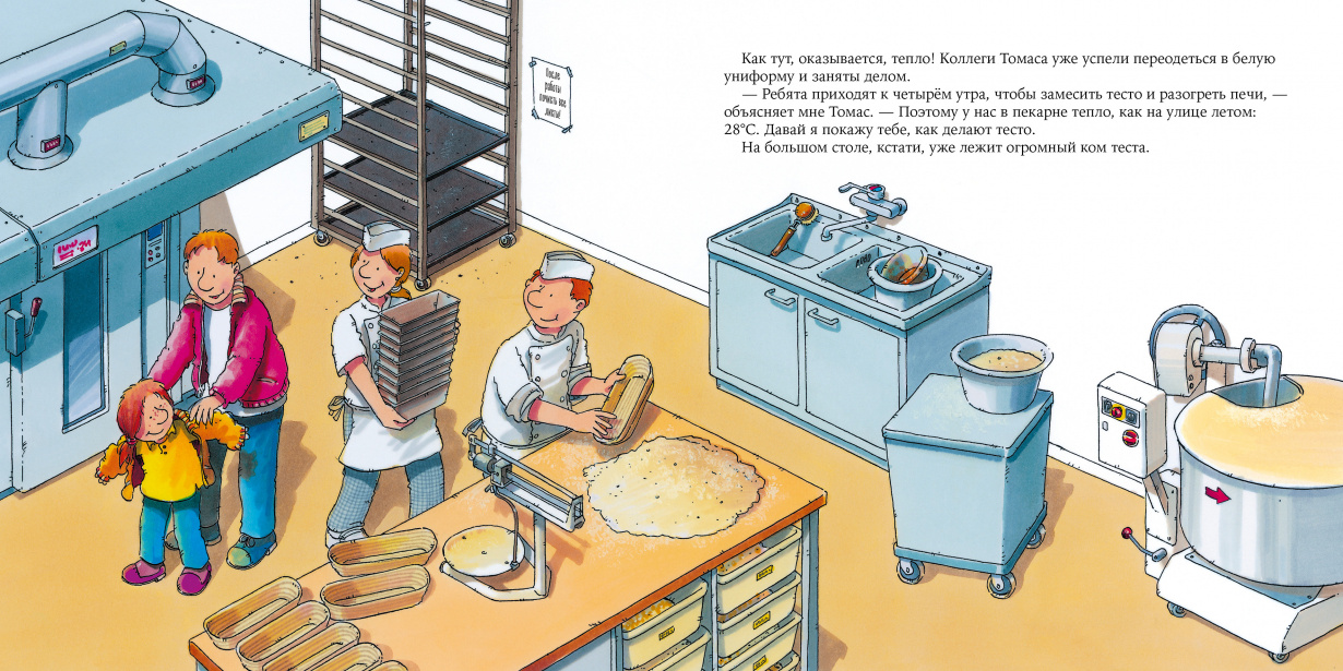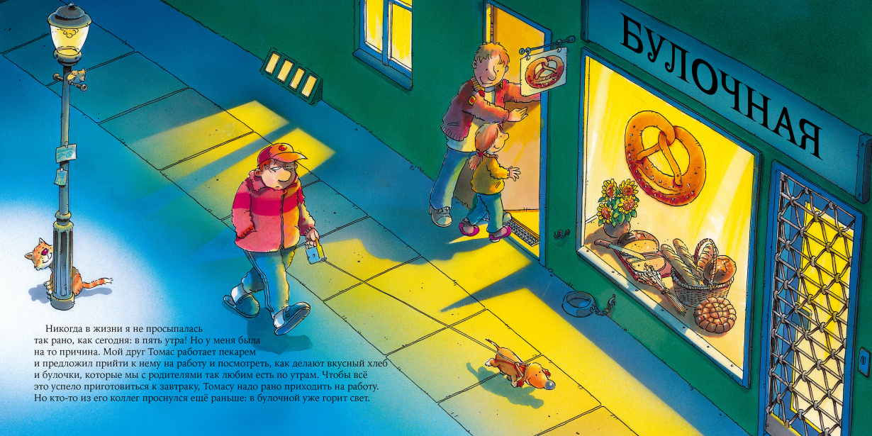 «Никогда в жизни я не просыпалась так рано, как сегодня: в пять утра! Но у меня была на то причина. Мой друг Томас работает пекарем и предложил прийти к нему на работу, чтобы посмотреть, как делают вкусный хлеб и булочки, которые мы с родителями так любим есть по утрам. Чтобы всё это успело приготовиться к завтраку, Томасу надо очень рано приходить на работу. Но кто-то из его коллег проснулся ещё раньше: в булочной уже горит свет».
