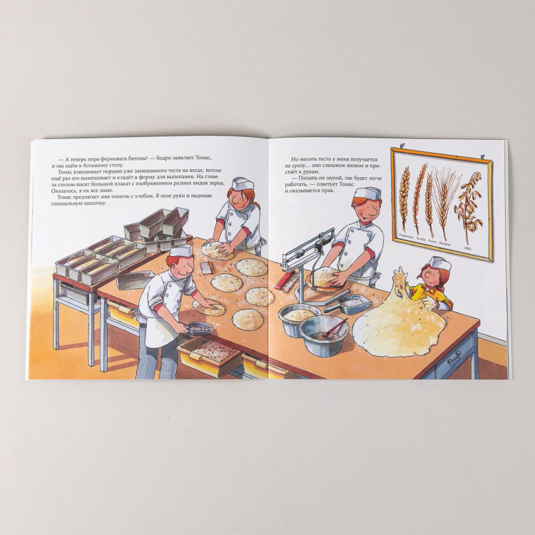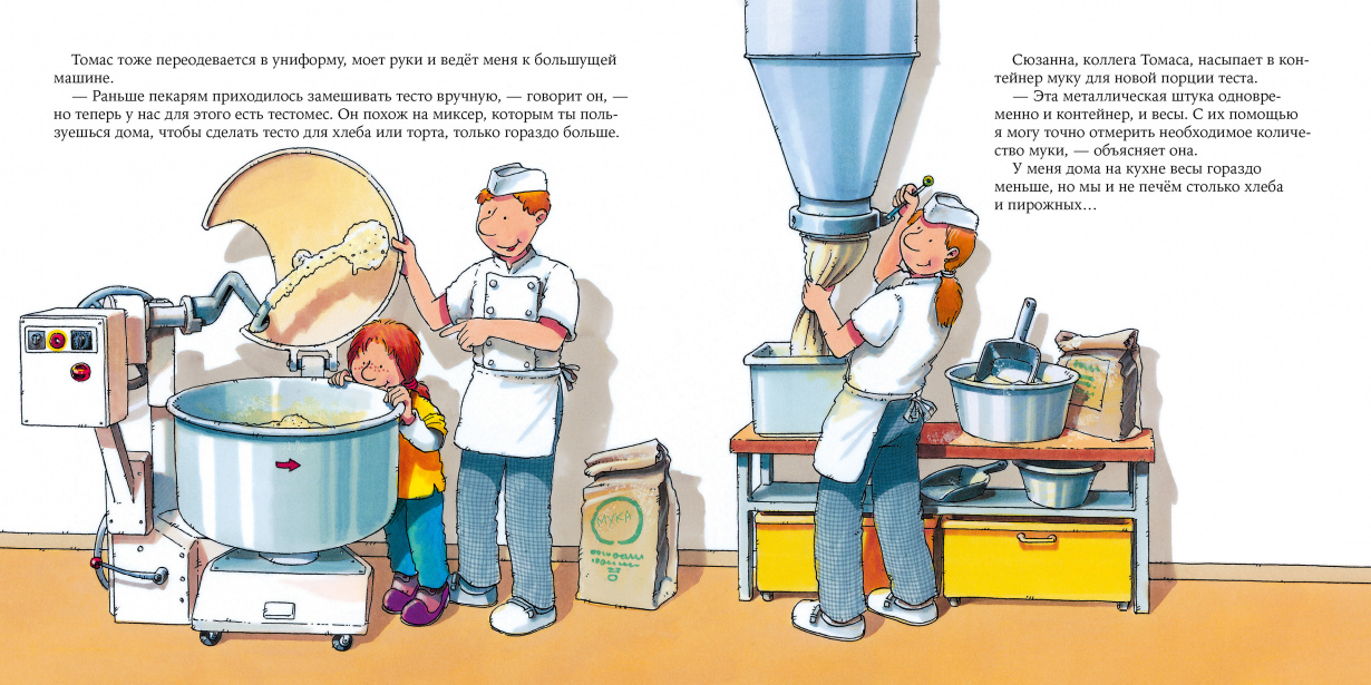 Все книги построены по принципу «один день из жизни...»: герои историй, дети, приходят в гости на работу к своим взрослым знакомым. В этой книге девочка проводит целый день со своим соседом - пекарем. Оказывается, чтобы мы с вами могли съесть на завтрак свежие булочки, работникам пекарни приходится вставать очень-очень рано! Читатели узнают из чего и как готовят хлеб, какие бывают сорта, как устроена работа пекарни и булочной. Бонус - рецепт вкусных сдобных булочек с изюмом.