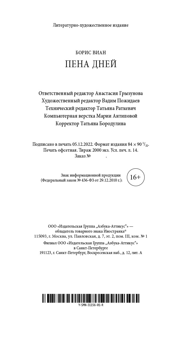 За свои 39 лет Борис Виан успел побывать инженером и изобретателем, джазовым трубачом и музыкальным критиком, поэтом, романистом, драматургом, сценаристом, актером, переводчиком Рэймонда Чандлера, чтецом и исполнителем собственных песен. Время отводило на все считаные секунды. Виан родился рано и прожил быстро. Виан был слишком молод. Мир был слишком стар. Музыкальное творчество Бориса Виана ценил Жорж Брассенс, а Серж Гензбур, услышав песни Виана, решил сочинять и петь сам; Виан показал Франции первые образцы французского рок-н-ролла. Прикидываясь американцем, Виан написал несколько успешных коммерческих романов, а оставаясь собой - несколько уникальных книг, не оцененных при его жизни, но повлиявших на все дальнейшее развитие французской литературы и ставших бестселлерами после его смерти. Впервые напечатанный в 1947 году, лучший роман Виана «Пена дней» - сюрреалистическая фантасмагория, высокая трагедия и комический танец под куполом. Фредерик Бегбедер отнюдь не случайно поставил его в первую десятку своего мирового литературного хит-парада. «Пена дней» - это простая история любви, в которой на каждом шагу происходит взрыв света и чувства, абсурдный и ослепительный, и которая до сих пор продолжает продаваться во всем мире миллионными тиражами.| Издательство | Иностранка |