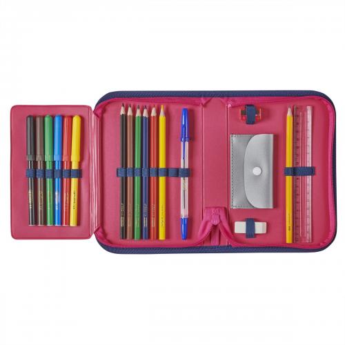 Материал: полиэстер Размер: 20,3 х 14 х 3,5 см Карандаш имеет 19 предметов - обычный карандаш, линейка, ластик, кротня, кошелек, шариковая ручка + однократное свободное пространство для ручки, 6 фломастеров, 6 цветных карандашей