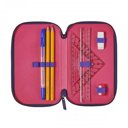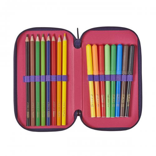 Материал: полиэйстер Размер: 19,3x11.5x4.5 см Карандаш с двумя отсеками - 23 приекшмец (8 карандашей, 8 фломастеров, 2 карандаши, 1 ручка, треугольник, линейка 16см, точилка для карандашей, ластик)