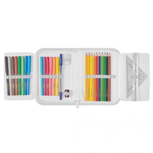 Материал: полиэйстер Размер: 20,3 х 14 х 3,5 см Карандаш с 31 предметами 14 Фломастеры, 1 ручка, ластик, разработанные, 2-й обычные карандаши, 1 свободное пространство в дополнение к ручке, трисструсле, линейке 17 см.