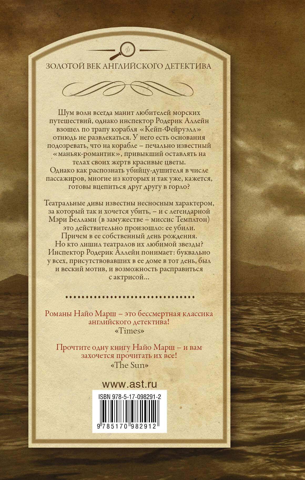 Шум волн всегда манит любителей морских путешествий, однако инспектор Родерик Аллейн взошел по трапу корабля "Кейп-Фейруэлл" отнюдь не развлекаться. У него есть основания подозревать, что на корабле - печально известный "маньяк-романтик", привыкший оставлять на телах своих жертв красивые цветы. Однако как распознать убийцу-душителя в числе пассажиров, многие из которых и так уже, кажется, готовы вцепиться друг другу в горло? Театральные дивы известны несносным характером, за который так и хочется убить, - и с легендарной Мэри Беллами (в замужестве - миссис Темплтон) это действительно произошло: ее убили. Причем в ее собственный день рождения. Но кто лишил театралов их любимой звезды? Инспектор Родерик Аллейн понимает: буквально у всех присутствовавших в ее доме в тот день был и веский мотив, и возможность расправиться с актрисой…| Издательство | Издательство "АСТ" |