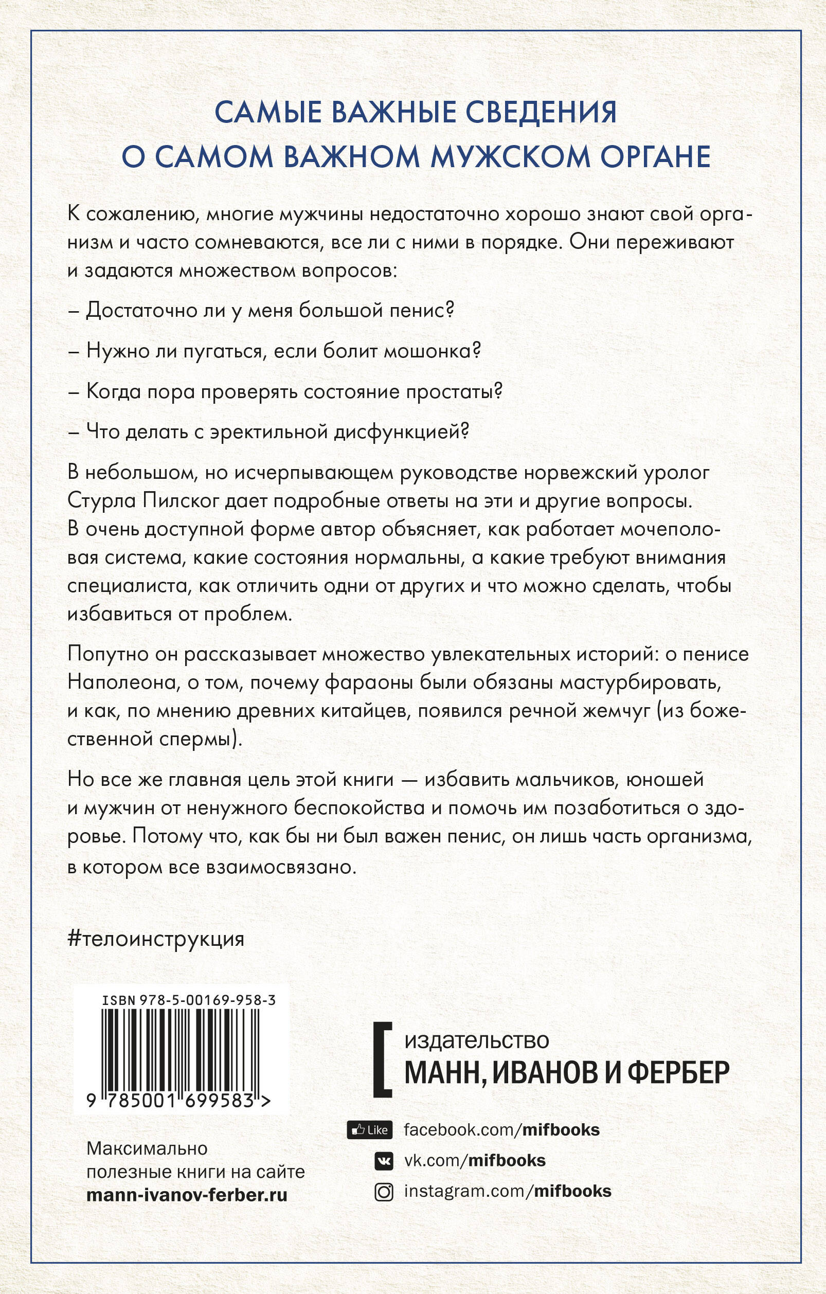Самые важные сведения о самом важном мужском инструменте. Вряд ли найдется другой орган, который вызывал бы столько любви, ненависти и споров. Но к сожалению, мужчины до сих пор недостаточно хорошо знают свой организм и часто испытывают напрасное беспокойство, сомневаясь, все ли с ними в порядке. Вот наиболее частые вопросы: - а достаточно ли он большой? - почему возникают поллюции? - может ли использование мобильного телефона привести к бесплодию? - почему болит мошонка? В этом небольшом, но исчерпывающем руководстве норвежский уролог Стурла Пилског дает ответы на эти и другие вопросы. Вы узнаете, как устроена мужская мочеполовая система, что является нормальным, а что нет, к каким состояниям следует относиться серьезно и что можно предпринять, чтобы избавиться от проблем. Цель автора - помочь мальчикам и мужчинам избавиться от ненужного беспокойства и заставить их гордиться своим телом. Попутно читатель прочитает множество интересных фактов: о том, что использовали наши предки в качестве виагры, о пенисе Наполеона, о фантомных пенисах. Для кого эта книга: Для тех, кто хочет понять, как устроены мужские половые органы. Для тех, кто хочет научиться лучше заботиться о мужском здоровье.| Издательство | МАНН, ИВАНОВ И ФЕРБЕР ООО |