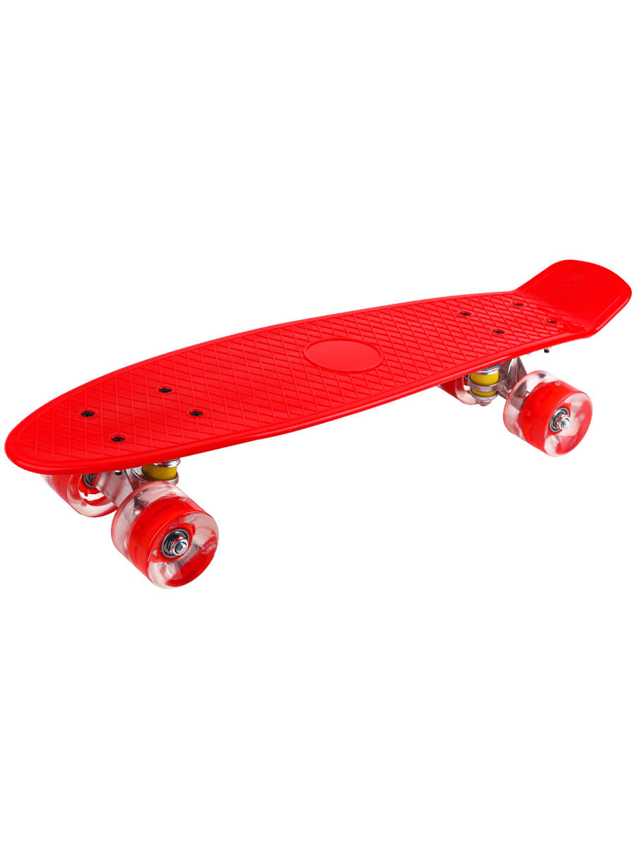 Аннотация: Пенниборд (56х14х10) дека пластик, основа алюм., колеса ПУ со светом, красный (Арт. WX-201R)