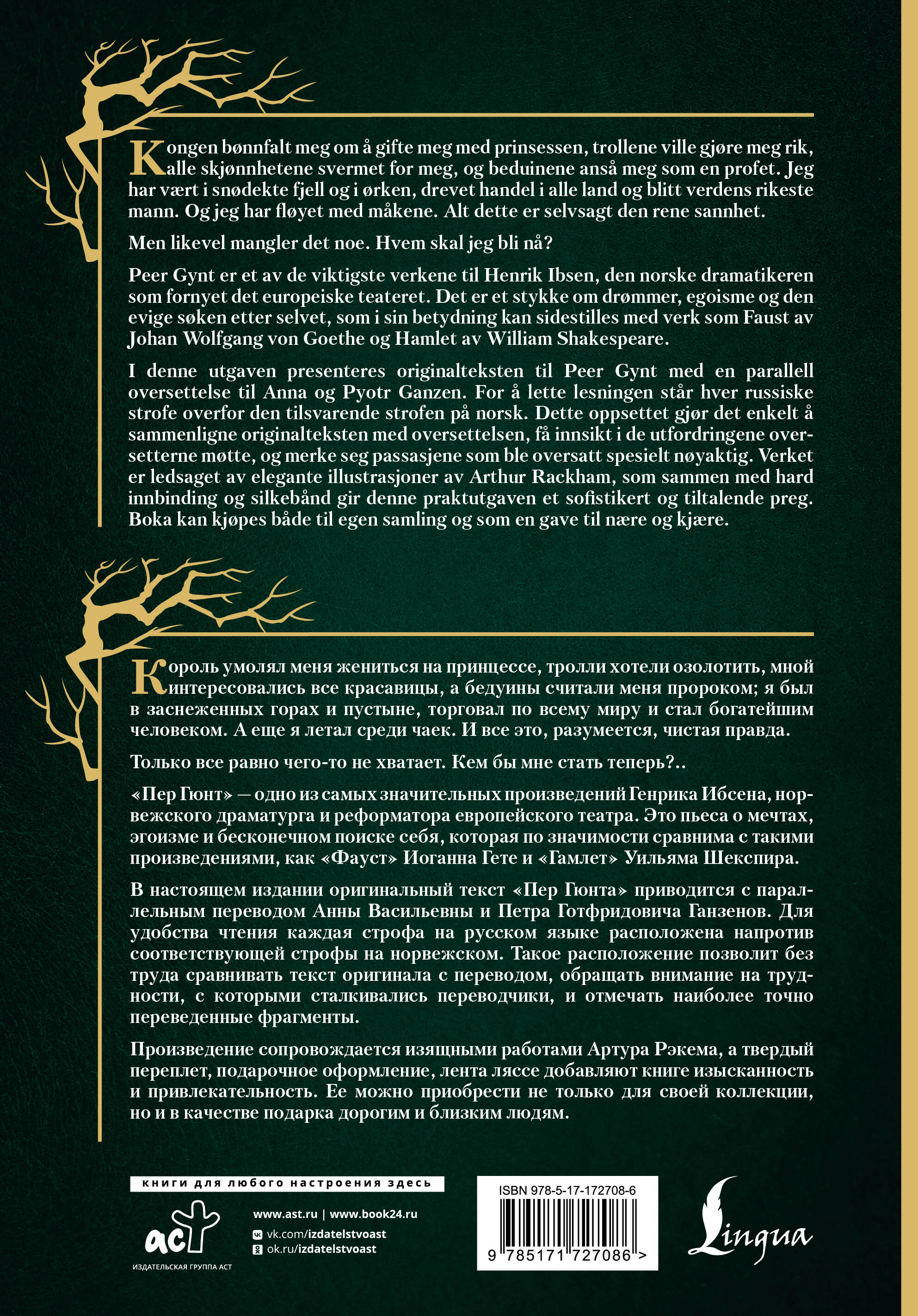 Король умолял меня жениться на принцессе, тролли хотели озолотить, мной интересовались все красавицы, а бедуины считали меня пророком; я был в заснеженных горах и пустыне, торговал по всему миру и стал богатейшим человеком. А еще я летал среди чаек. И все это, разумеется, чистая правда. Только все равно чего-то не хватает. Кем бы мне стать теперь?.. "Пер Гюнт" - одно из самых значительных произведений Генрика Ибсена, норвежского драматурга и реформатора европейского театра. Это пьеса о мечтах, эгоизме и бесконечном поиске себя, которая по значимости сравнима с такими произведениями, как "Фауст" Иоганна Гете и "Гамлет" Уильяма Шекспира. В настоящем издании оригинальный текст "Пер Гюнта" приводится с параллельным переводом Анны и Петра Ганзенов. Для удобства чтения каждая строфа на русском языке расположена напротив соответствующей строфы на норвежском. Такое расположение позволит без труда сравнивать текст оригинала с переводом, обращать внимание на трудности, с которыми сталкивались переводчики, и отмечать наиболее точно переведенные фрагменты. Произведение сопровождается фантазийными иллюстрациями Артура Рэкема, Джона Остина, Теодора Киттельсена, Эрика Вереншёлля и Ганса Клубера. Подарочное оформление, твердый переплет, белая бумага, иллюстрации, красивый макет, цветная лента ляссе добавляют книге изысканность и привлекательность. Ее можно приобрести не только для своей коллекции, но и в качестве подарка дорогим и близким людям.| Издательство | Издательство "АСТ" |