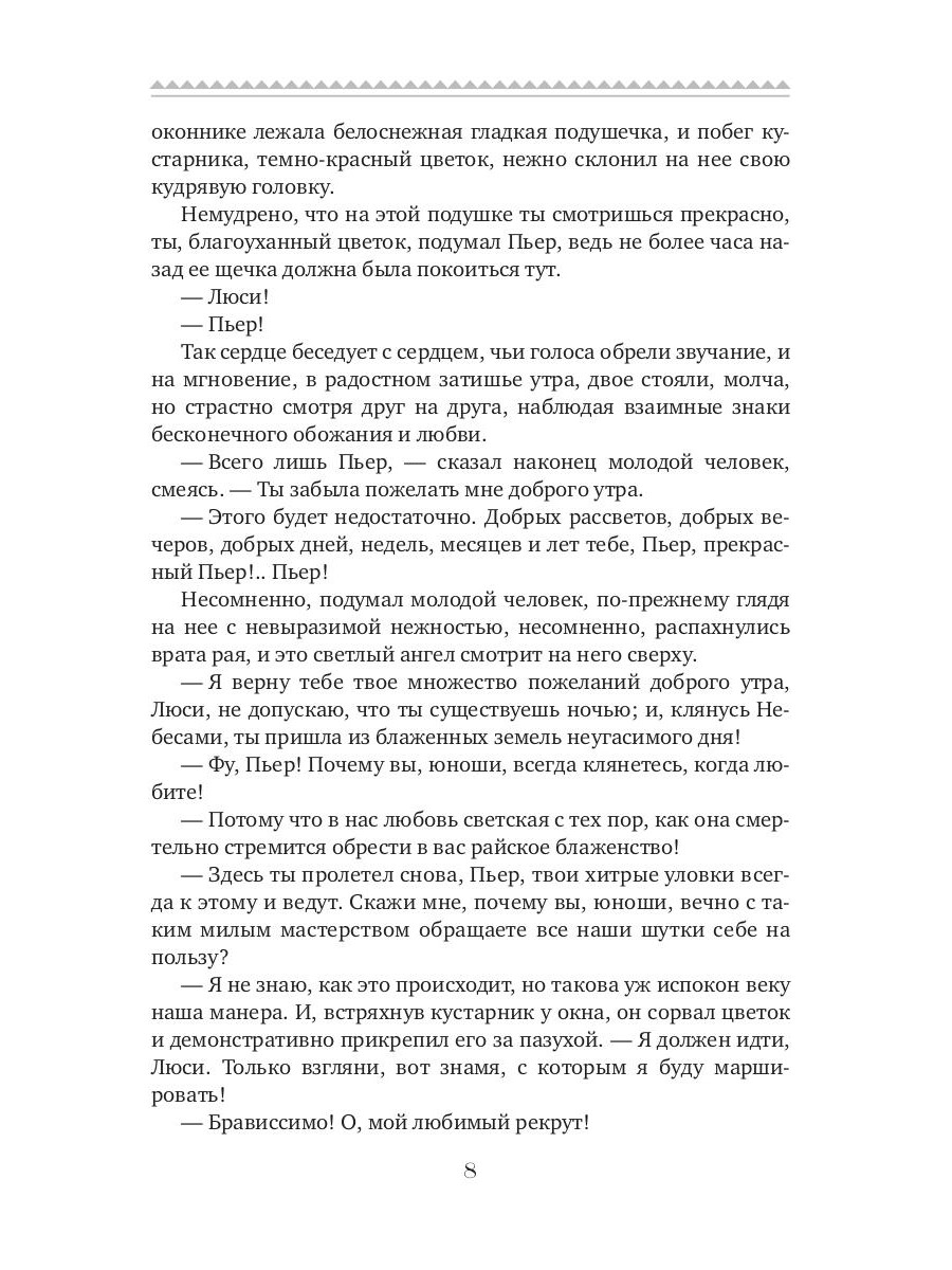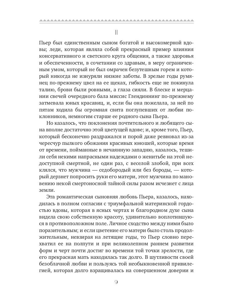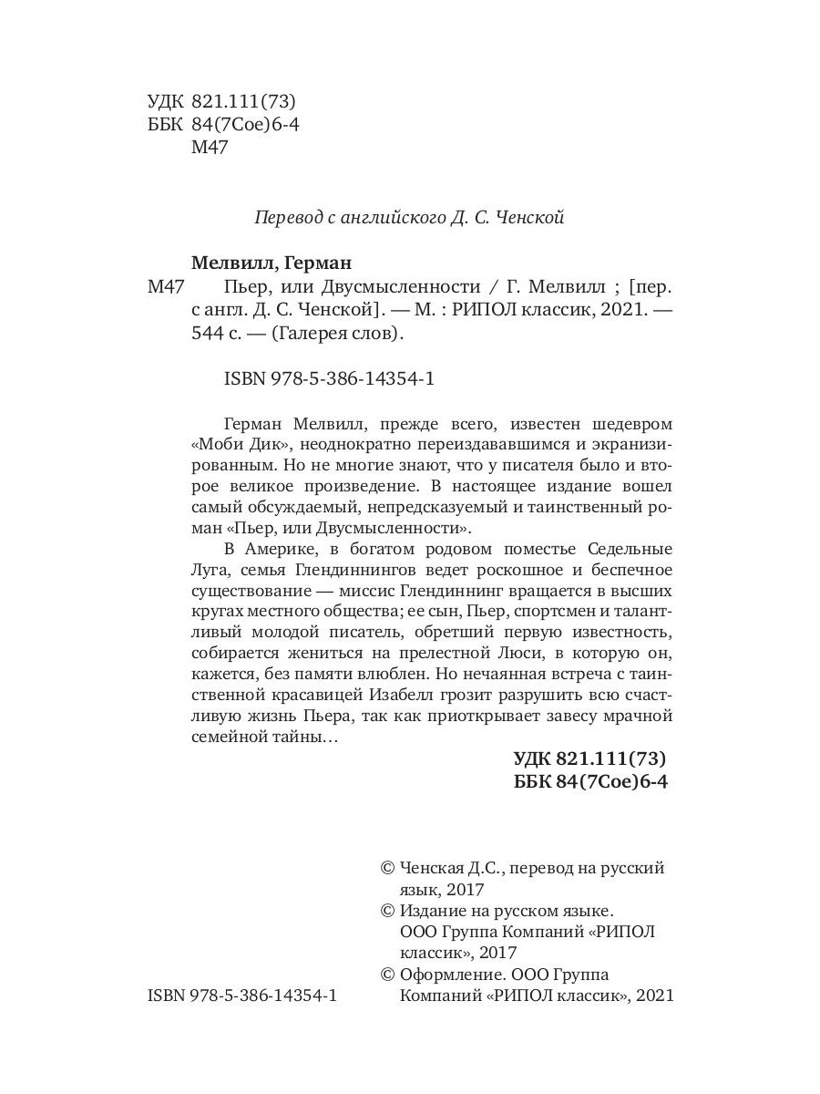 Герман Мелвилл, прежде всего, известен шедевром «Моби Дик», неоднократно переиздававшимся и экранизированным. Но не многие знают, что у писателя было и второе великое произведение. В настоящее издание вошел самый обсуждаемый, непредсказуемый и таинственный роман «Пьер, или Двусмысленности», публикуемый на русском языке впервые. В Америке, в богатом родовом поместье Седельные Луга семья Глендиннингов ведет роскошное и беспечное существование - миссис Глендиннинг вращается в высших кругах местного общества; ее сын, Пьер - спортсмен и талантливый молодой писатель, обретший первую известность, собирается жениться на прелестной Люси, в которую он, кажется, без памяти влюблен. Но нечаянная встреча с таинственной красавицей Изабелл грозит разрушить всю счастливую жизнь Пьера, так как приоткрывает завесу мрачной семейной тайны…| Издательство | Рипол Классик |
