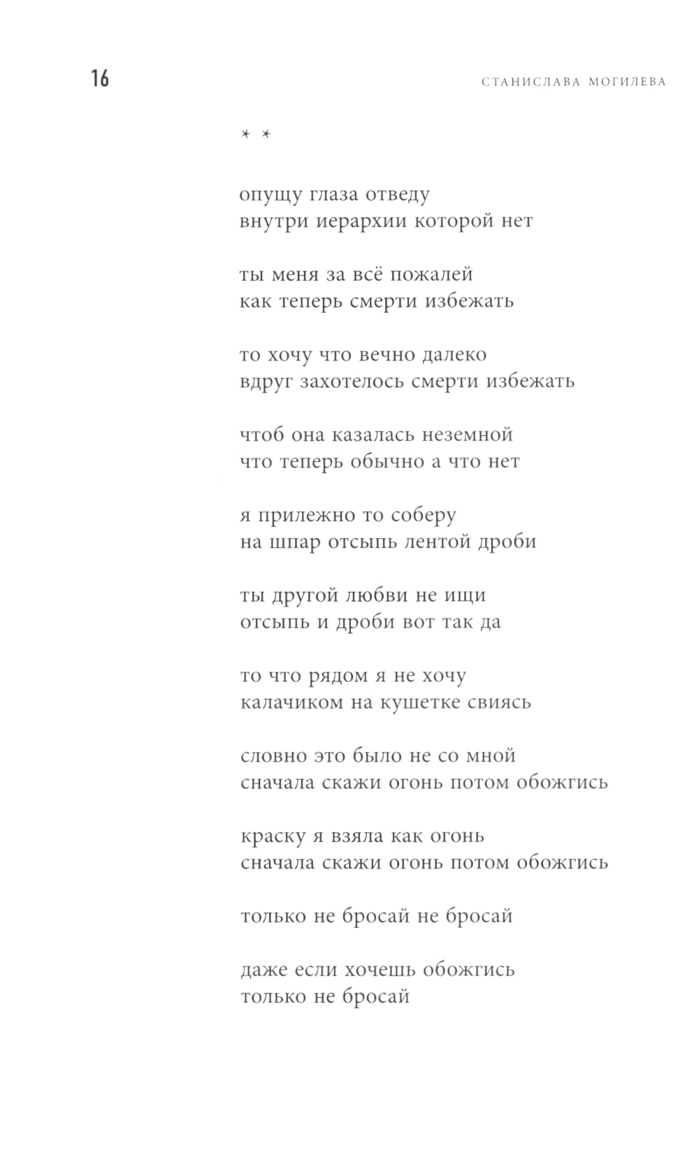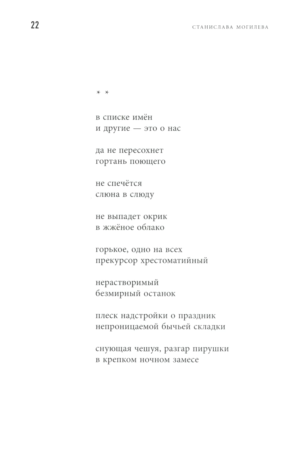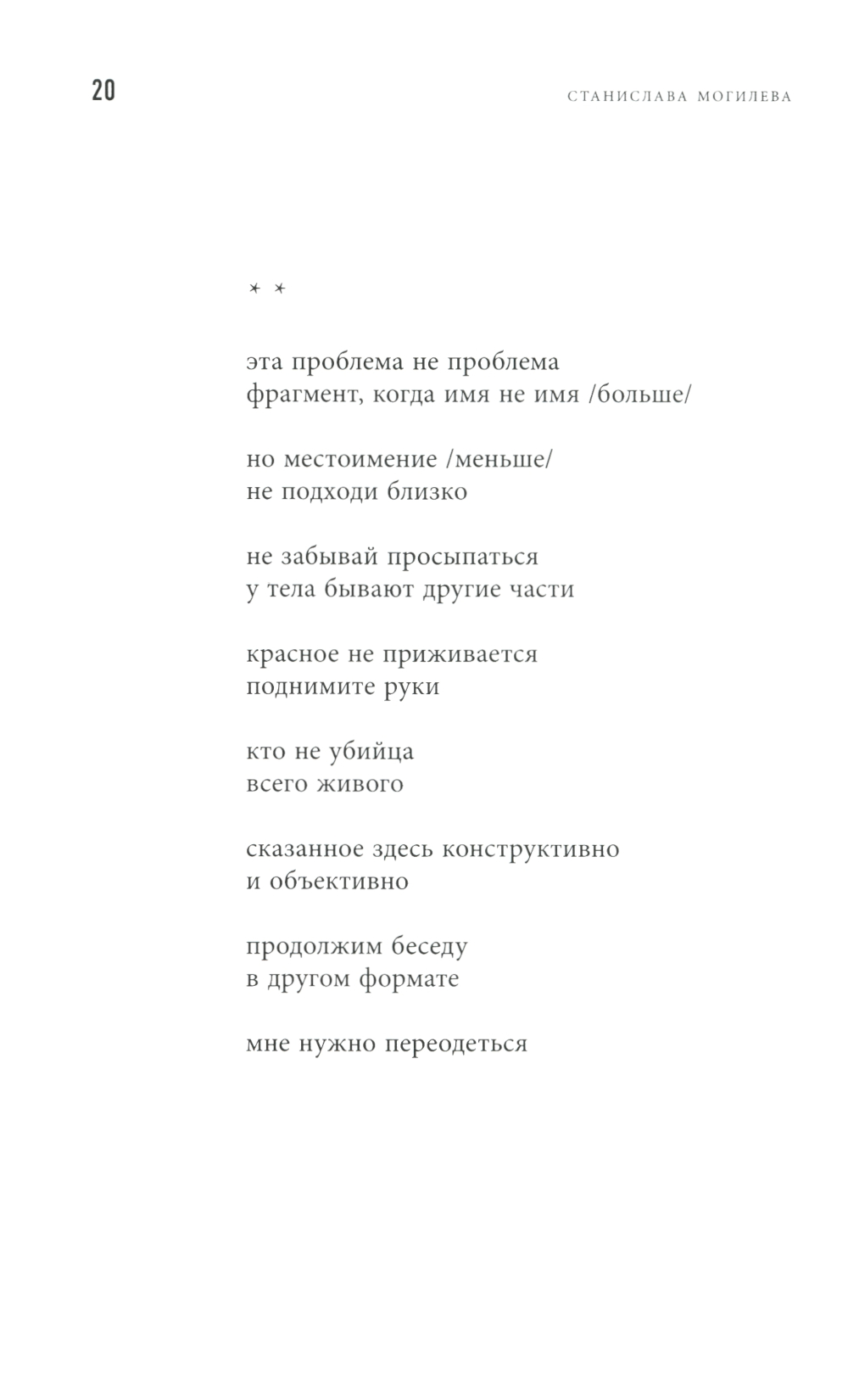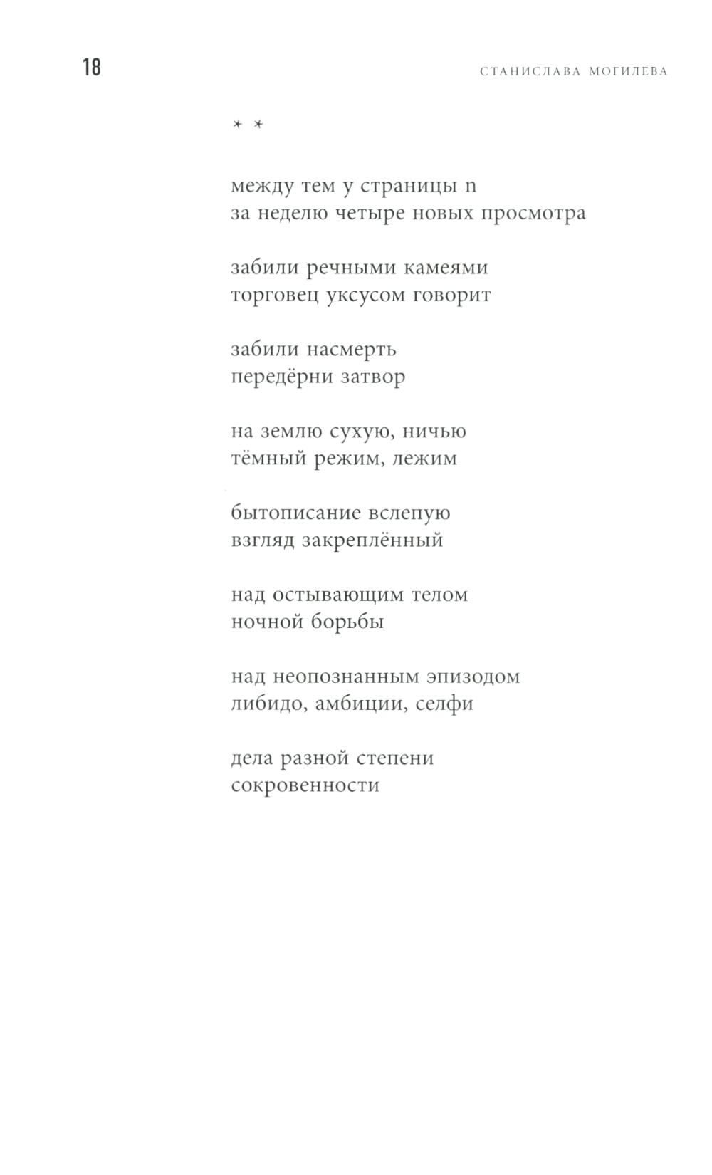 Сбивчивая, стремительная речь в новой книге Станиславы Могилевой прошита, синкопирована голосами других. Это не только голоса персонажей («говорит настя», «говорит серафима»), но и запросы социальных сетей, обрывки переписки в чатах, реклама, анонимный «мусор» быстрых коммуникаций, языковые и поэтические клише, идеологемы и прочее. И в этом коловращении человеческая речь, перфорированная отчуждением и опытом насилия, ищет внутреннюю опору, место, в котором может завязаться слабая жизнь, сказаться подлинное и живое. Станислава Могилева?-поэтесса, кураторка, соредакторка платформы «Ф-письмо на Сигме». Родилась в Норильске в 1983 году. Публиковалась в журналах «НЛО», «Воздух», «Волга», «Транслит», «Парадигма», «Среда», в сетевых изданиях «TextOnly», «Цирк "Олимп"», «Двоеточие», «Артикуляция», «Stenograme», «Лиterraтура», «sexispure» и др. Участница международной антологии феминистской поэзии «F Letter» (2020). Автор книг стихов «Обратный порядок» (2016), «Это происходит с кем-то другим» (2018). Стихи переведены на английский, шведский и польский языки. Живет в Санкт-Петербурге.