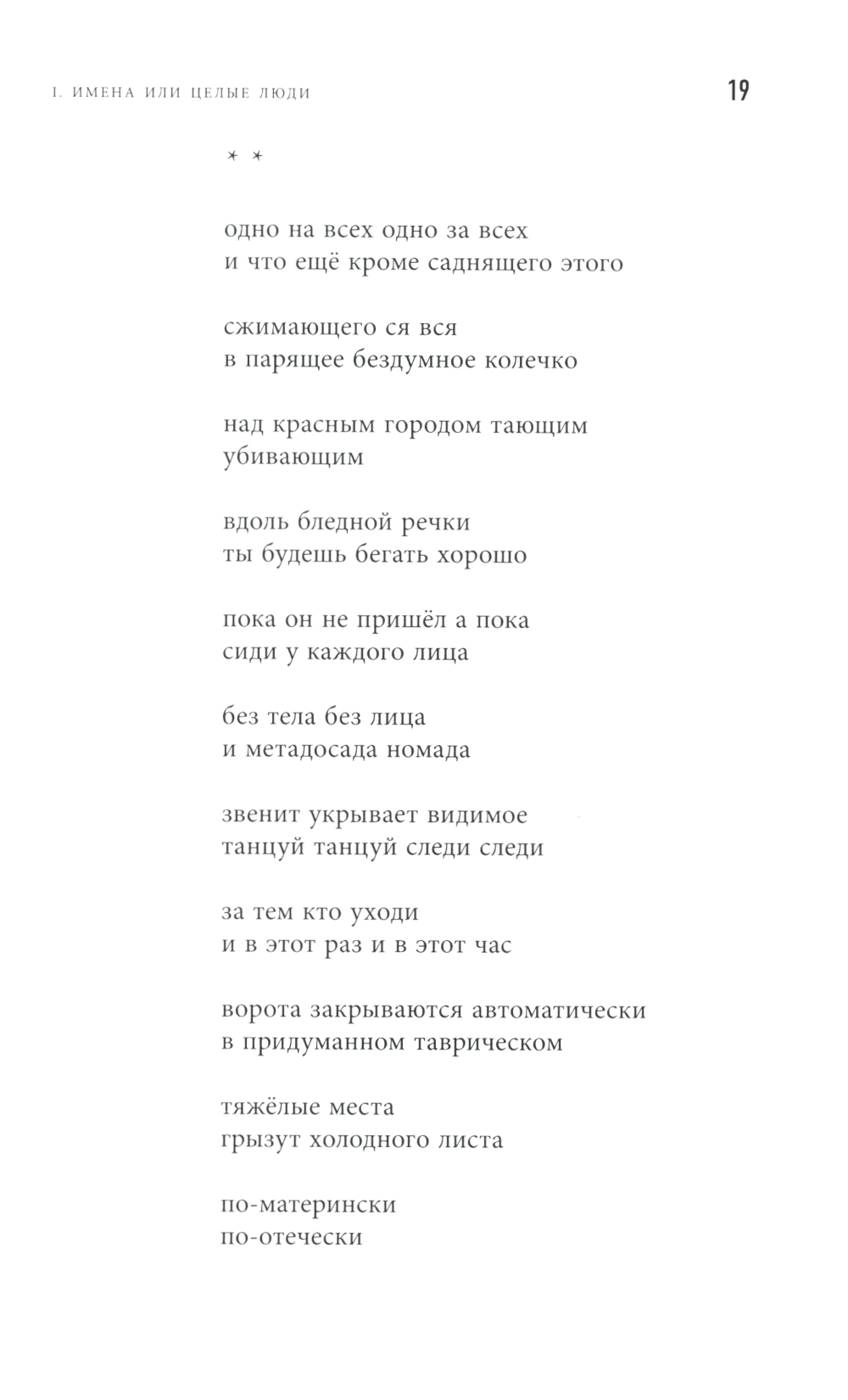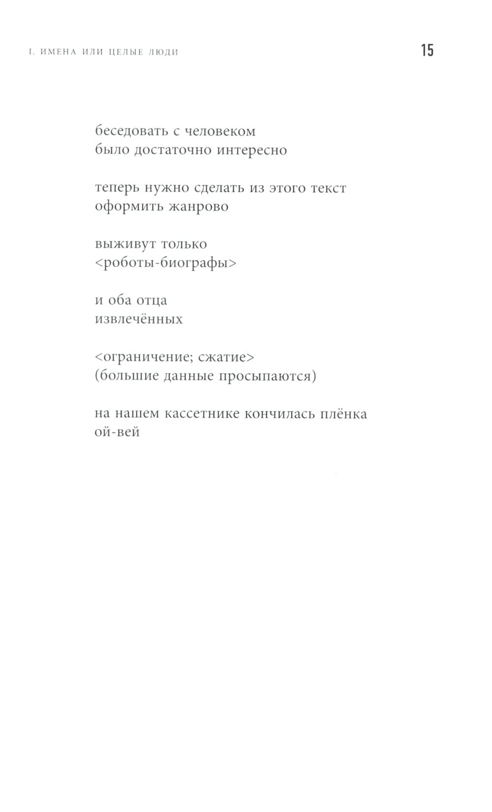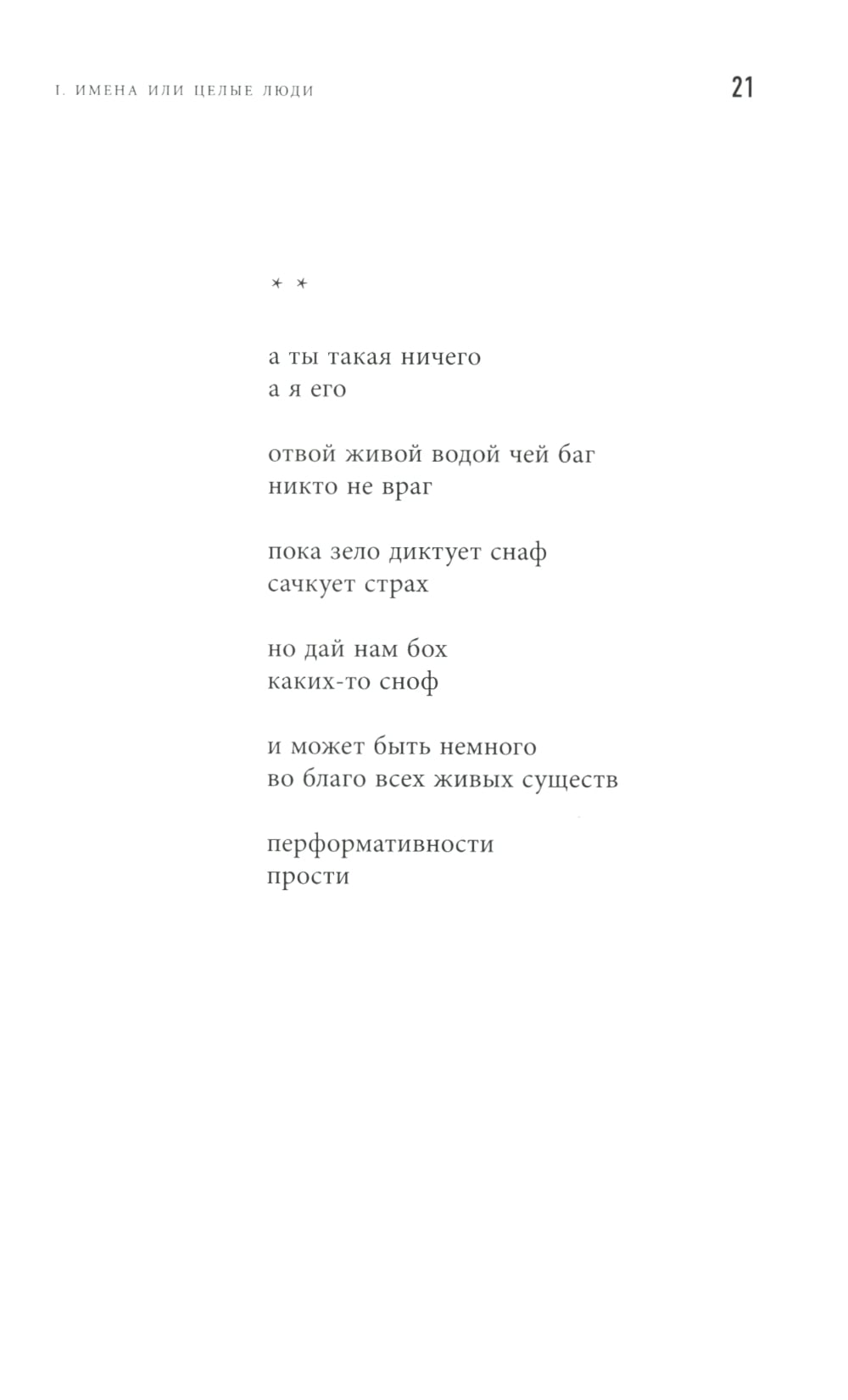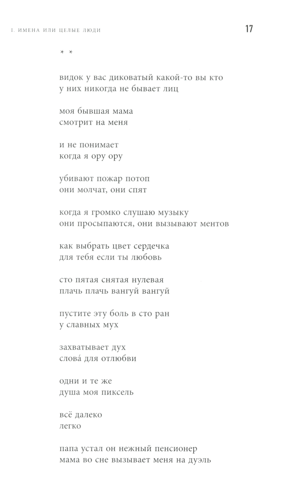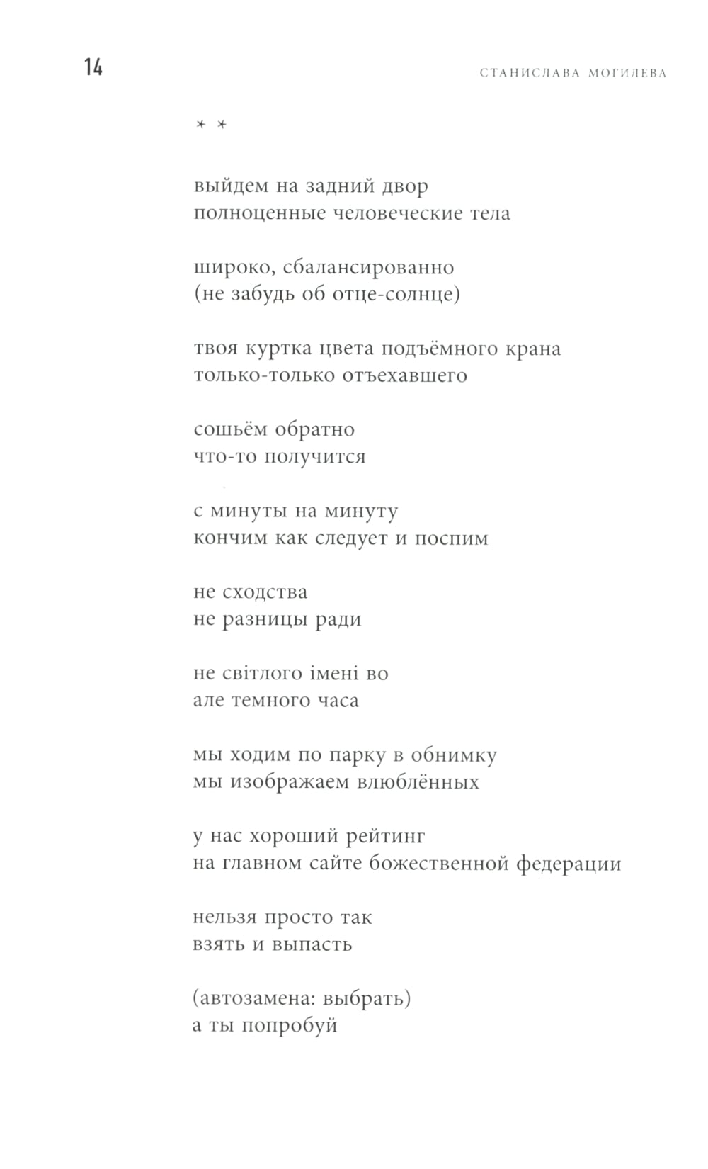 Сбивчивая, стремительная речь в новой книге Станиславы Могилевой прошита, синкопирована голосами других. Это не только голоса персонажей («говорит настя», «говорит серафима»), но и запросы социальных сетей, обрывки переписки в чатах, реклама, анонимный «мусор» быстрых коммуникаций, языковые и поэтические клише, идеологемы и прочее. И в этом коловращении человеческая речь, перфорированная отчуждением и опытом насилия, ищет внутреннюю опору, место, в котором может завязаться слабая жизнь, сказаться подлинное и живое. Станислава Могилева?-поэтесса, кураторка, соредакторка платформы «Ф-письмо на Сигме». Родилась в Норильске в 1983 году. Публиковалась в журналах «НЛО», «Воздух», «Волга», «Транслит», «Парадигма», «Среда», в сетевых изданиях «TextOnly», «Цирк "Олимп"», «Двоеточие», «Артикуляция», «Stenograme», «Лиterraтура», «sexispure» и др. Участница международной антологии феминистской поэзии «F Letter» (2020). Автор книг стихов «Обратный порядок» (2016), «Это происходит с кем-то другим» (2018). Стихи переведены на английский, шведский и польский языки. Живет в Санкт-Петербурге.