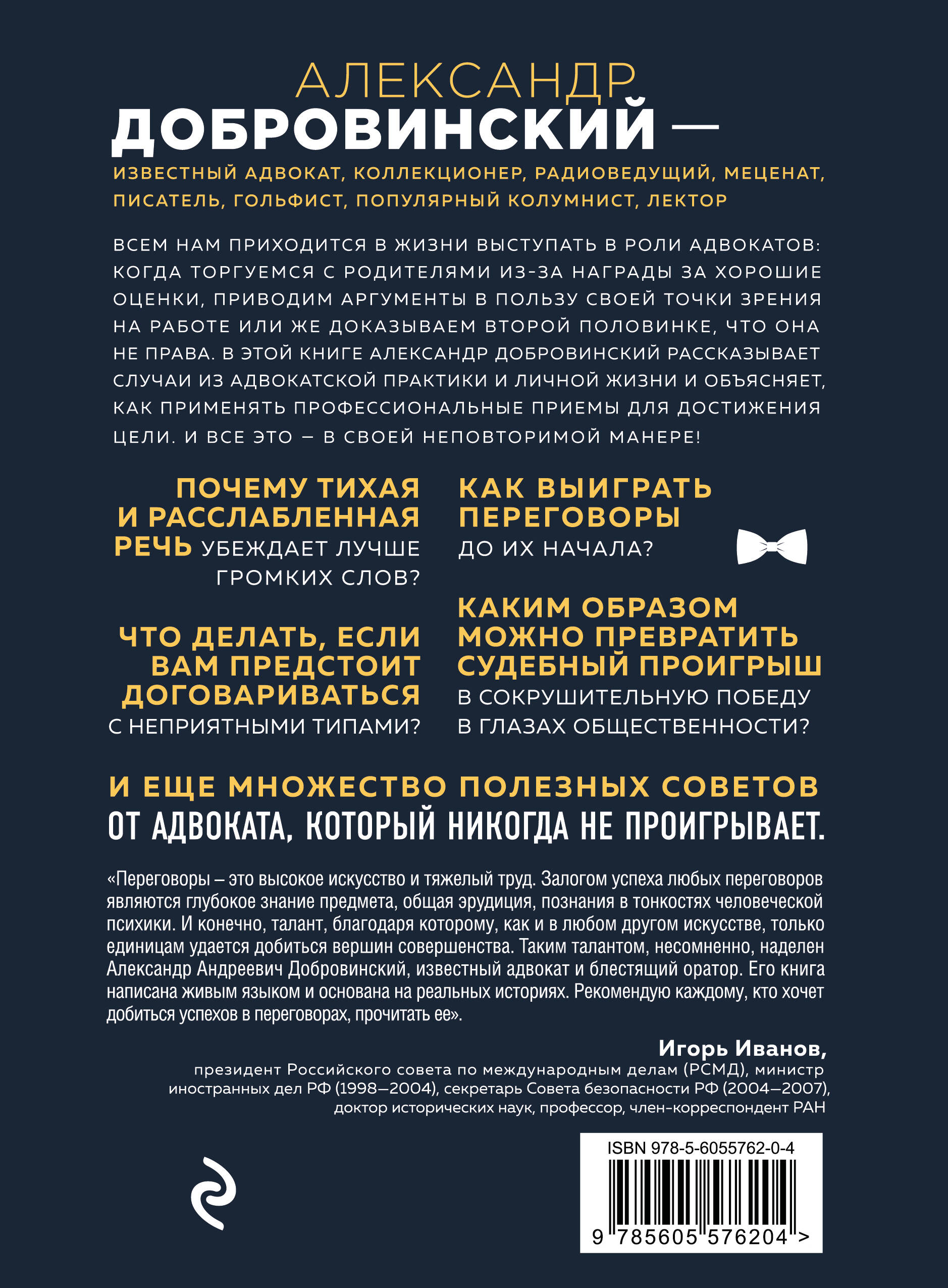 Александр Добровинский - известный адвокат, коллекционер, радиоведущий, меценат, писатель, гольфист, популярный колумнист, лектор. • Почему тихая и расслабленная речь убеждает лучше громких слов? • Как выиграть переговоры до их начала? • Каким образом можно превратить судебный проигрыш в сокрушительную победу в глазах общественности? • Что делать, если вам предстоит договариваться с неприятными типами? И еще множество полезных советов от адвоката, который никогда не проигрывает.| Издательство | ООО "Издательство "Эксмо" |