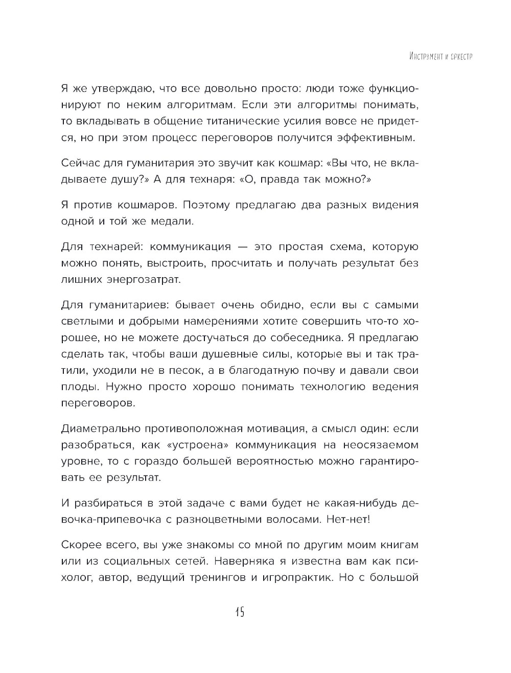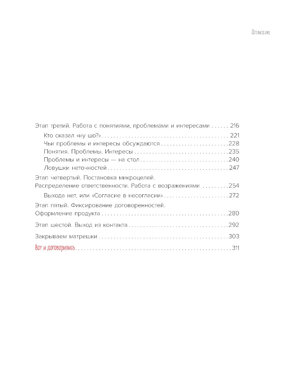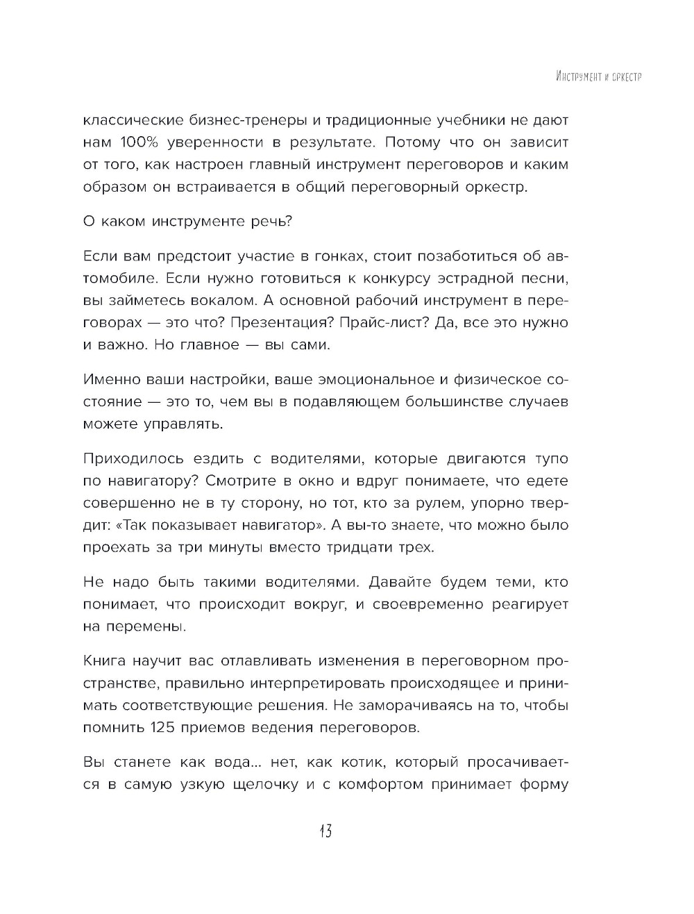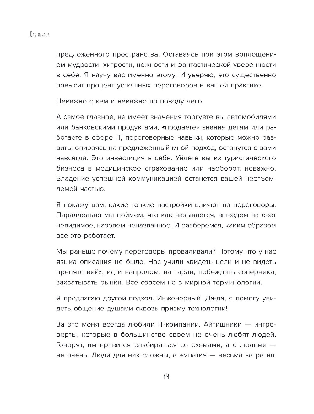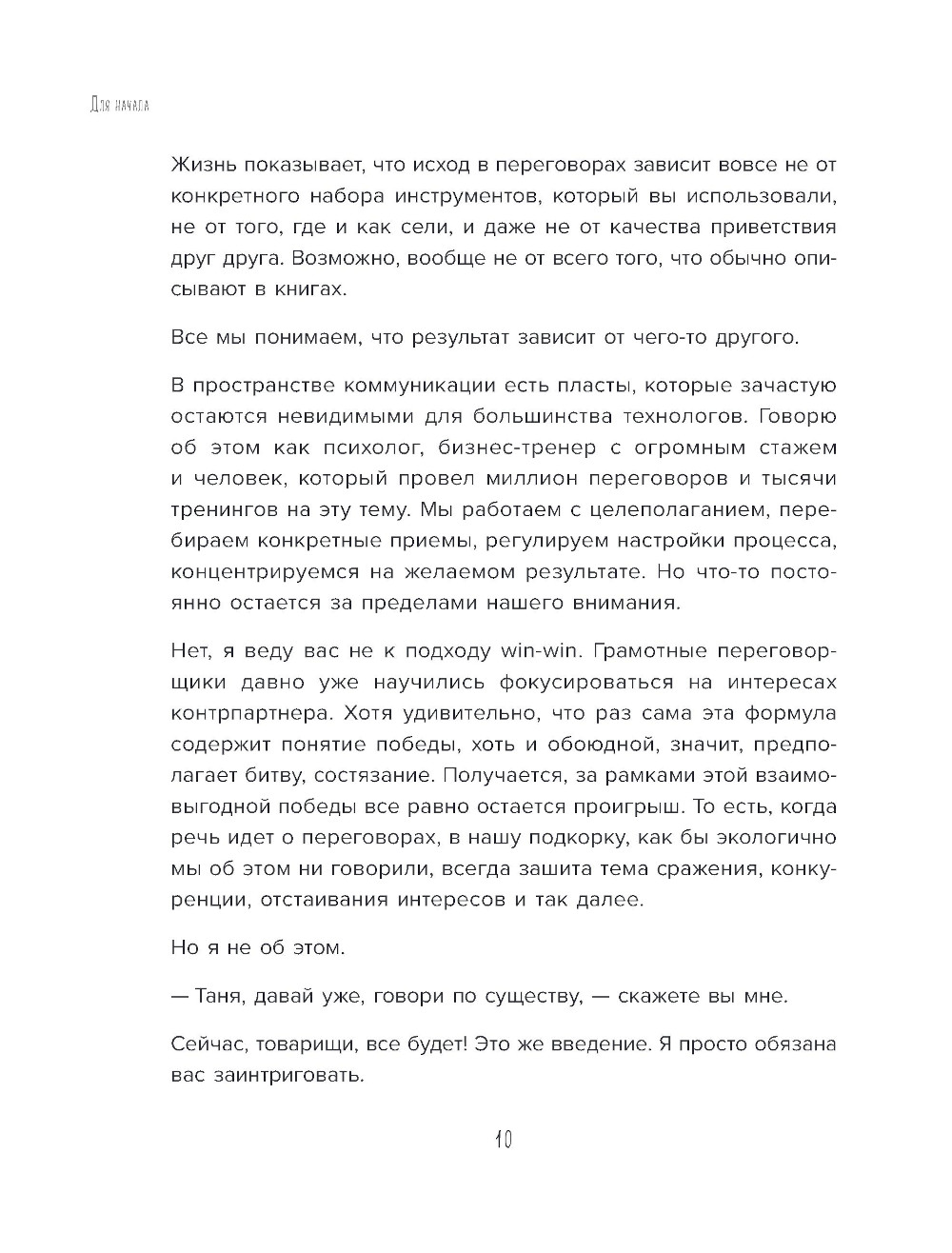 Не только в овальных кабинетах случаются переговоры. Вы договариваетесь об уборке комнаты с ребенком, о датах отпуска с партнером, о скидке на помидоры с продавцом. И каждый раз вы оказываетесь в трехмерном переговорном пространстве, которое, по Татьяне Мужицкой, состоит из задач, отношений и энергии. Задачи - это цели коммуникации, отношения - стиль взаимодействия участников, энергия - их состояние. И, чтобы коммуникация была результативной, важно поймать баланс по всем трем направлениям. Для этого автор предлагает простую поэтапную технологию. Освоив ее, можно изменить свое отношение к переговорам. Сделать их и эффективными, и интересными. Не зря ведь книга называется «Переговоры по душам».| Издательство | Эксмо |