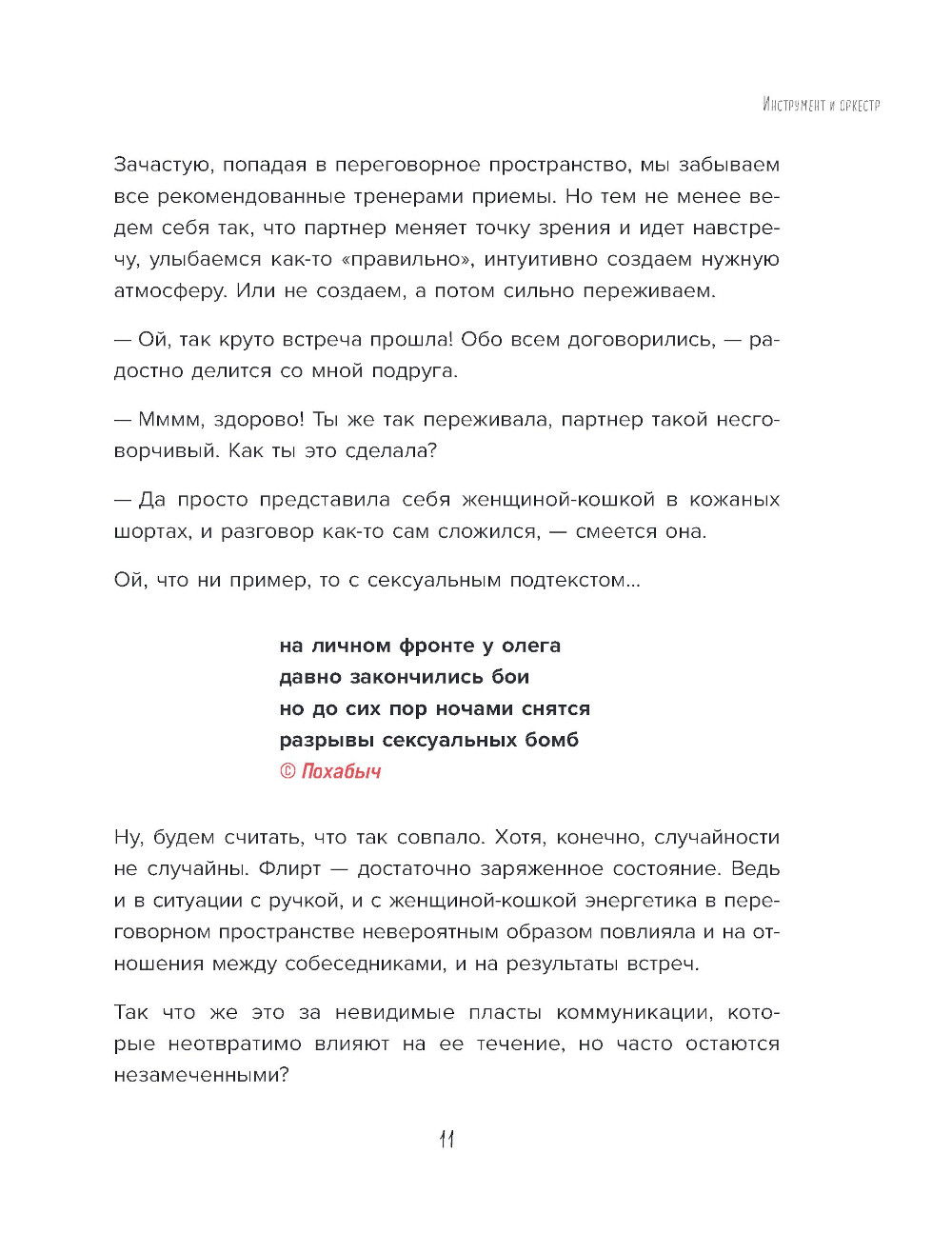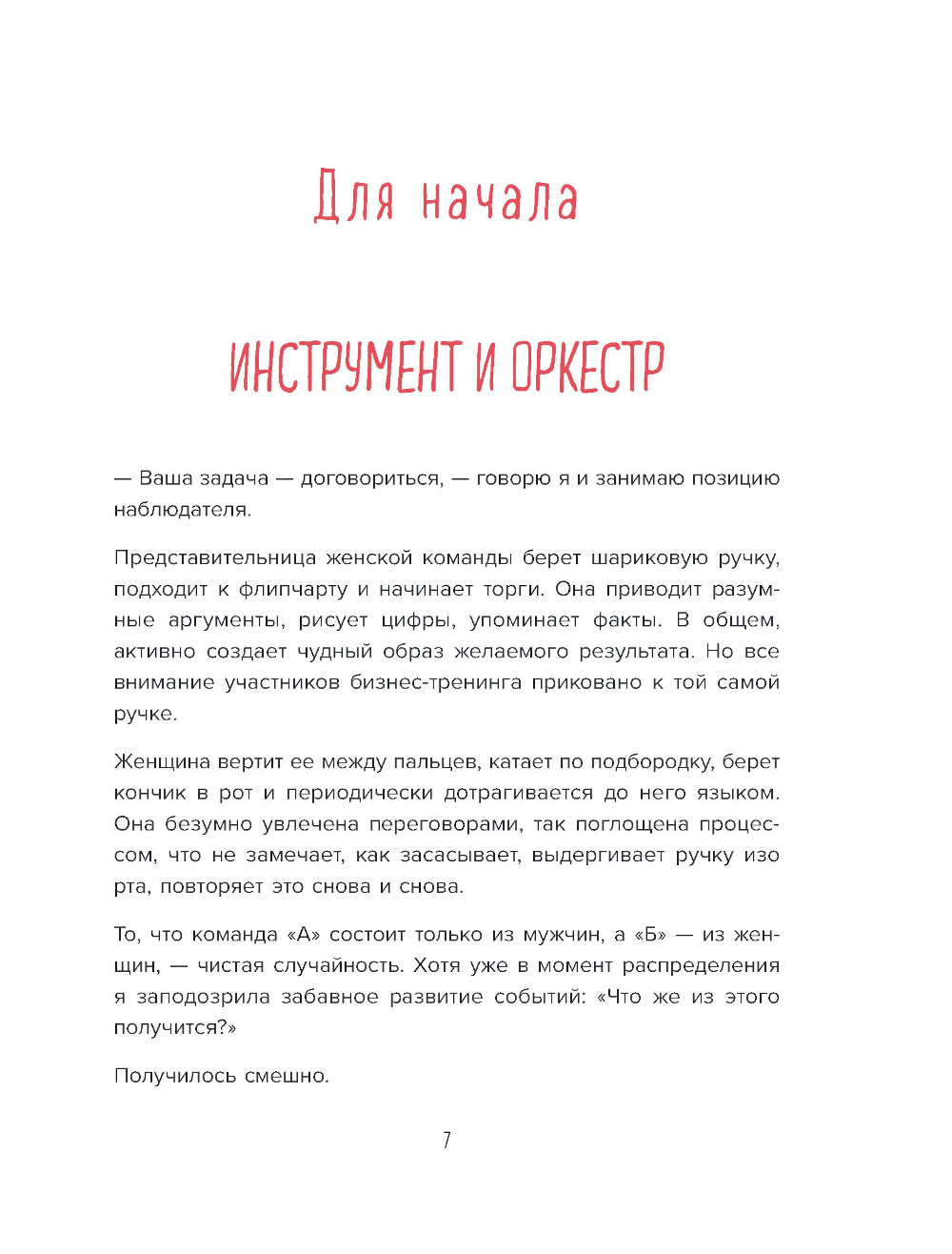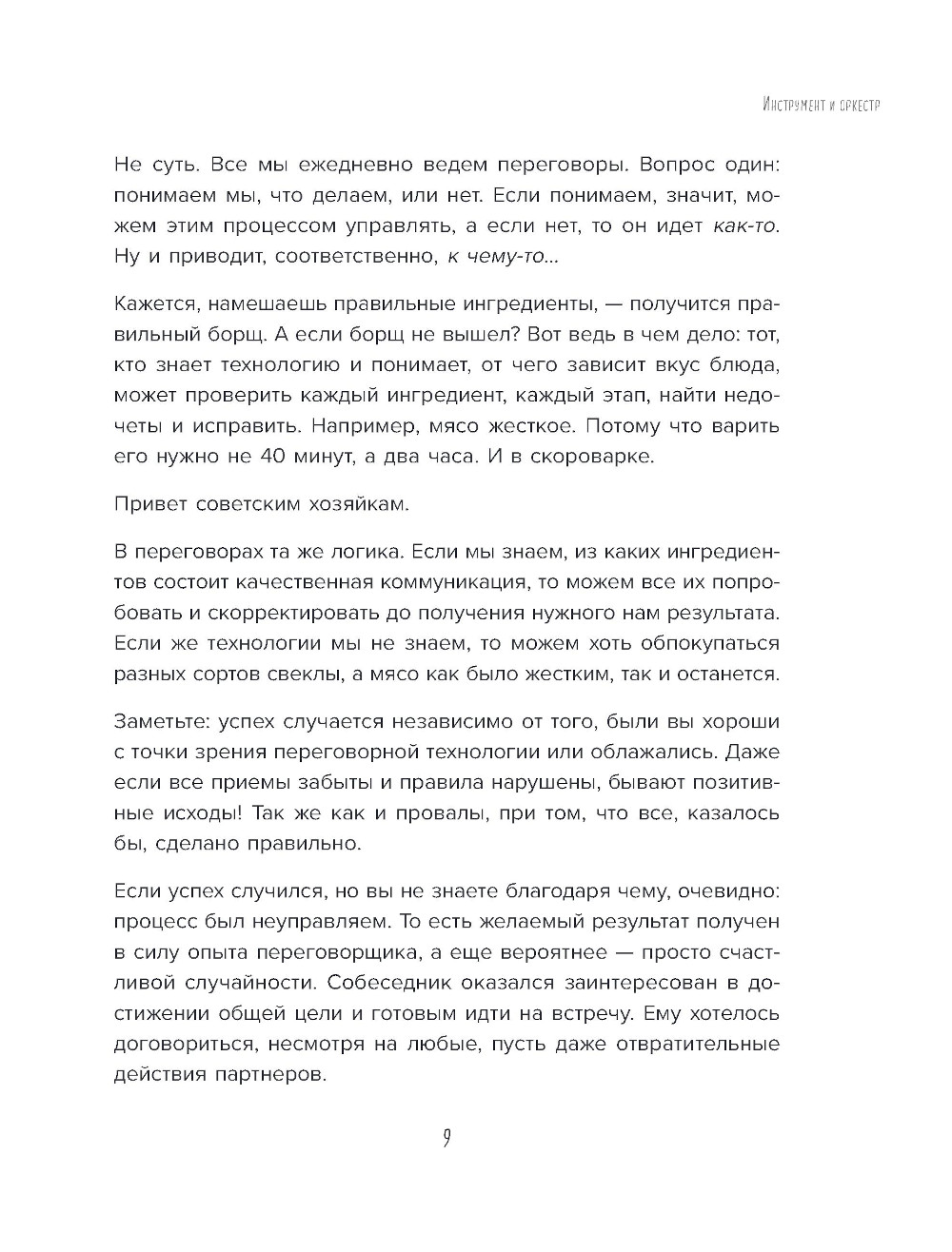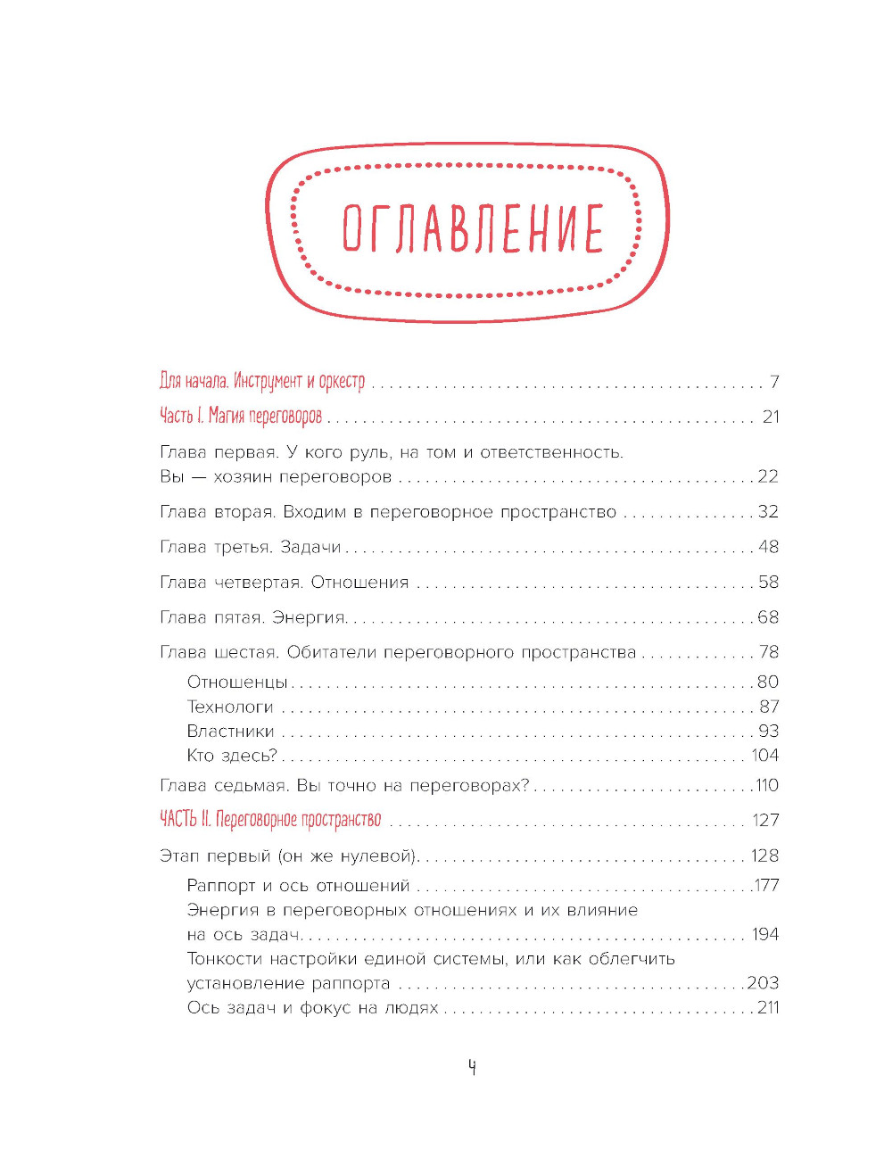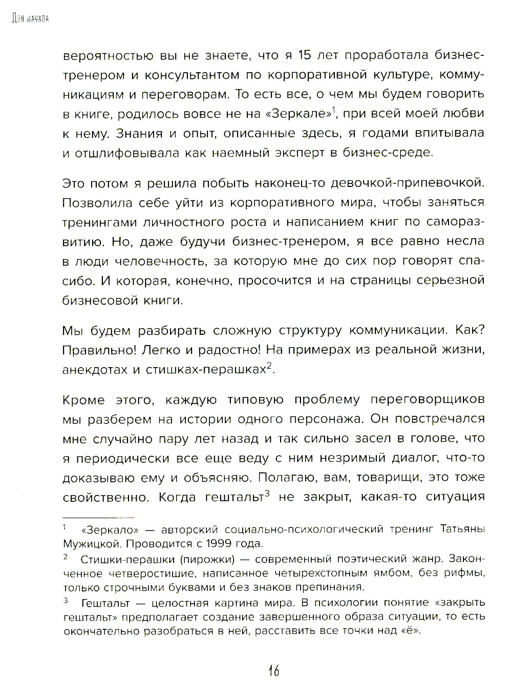 Не только в овальных кабинетах случаются переговоры. Вы договариваетесь об уборке комнаты с ребенком, о датах отпуска с партнером, о скидке на помидоры с продавцом. И каждый раз вы оказываетесь в трехмерном переговорном пространстве, которое, по Татьяне Мужицкой, состоит из задач, отношений и энергии. Задачи - это цели коммуникации, отношения - стиль взаимодействия участников, энергия - их состояние. И, чтобы коммуникация была результативной, важно поймать баланс по всем трем направлениям. Для этого автор предлагает простую поэтапную технологию. Освоив ее, можно изменить свое отношение к переговорам. Сделать их и эффективными, и интересными. Не зря ведь книга называется «Переговоры по душам».| Издательство | Эксмо |