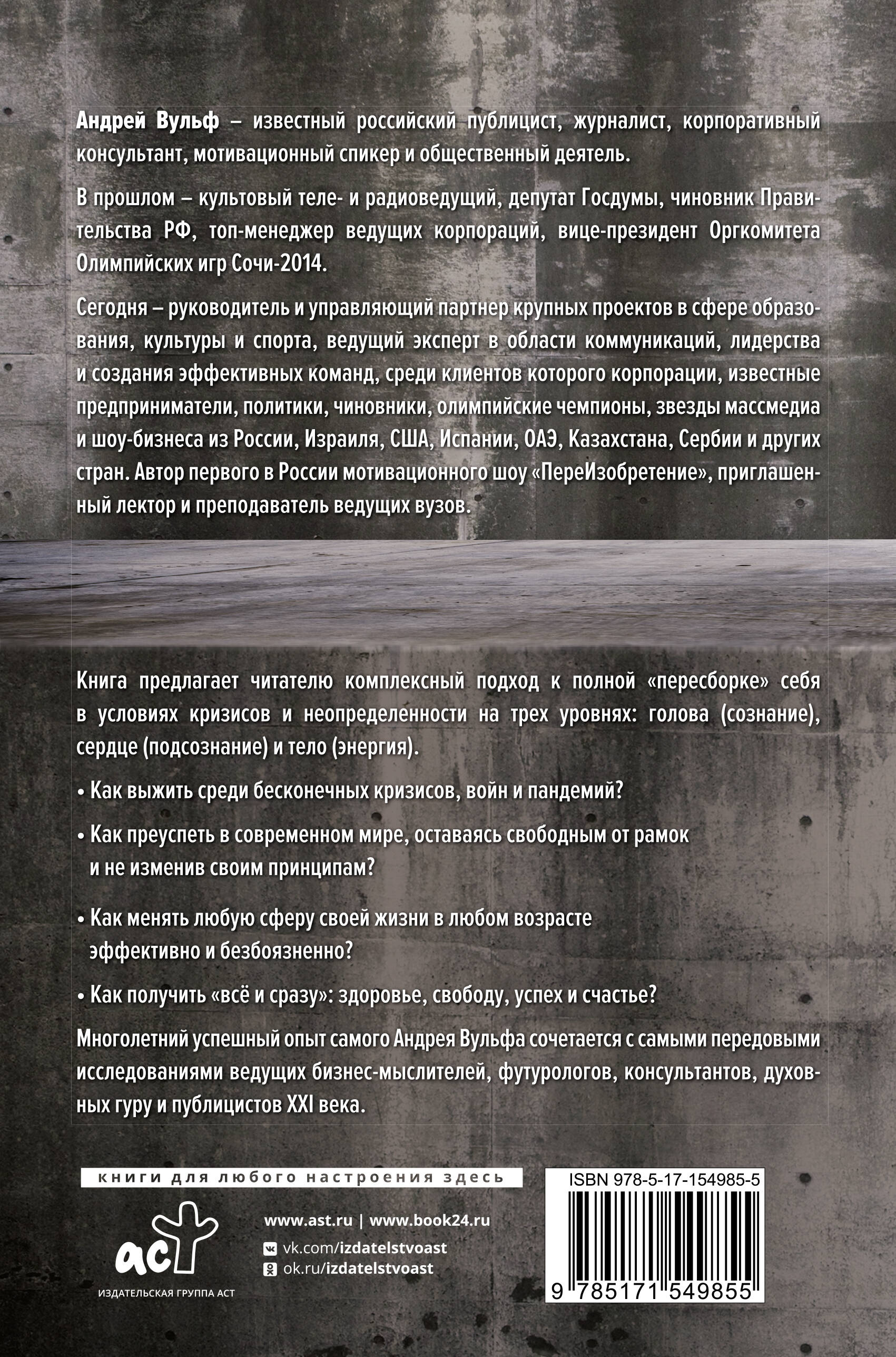 Андрей Вульф - известный российский публицист, журналист, корпоративный консультант, мотивационный спикер и общественный деятель, автор первого в России мотивационного шоу «ПереИзобретение». В прошлом - культовый теле- и радиоведущий, депутат Госдумы, чиновник Правительства РФ, топ-менеджер ведущих корпораций, вице-президент Оргкомитета Олимпийских Игр Сочи-2014. В своей книге Андрей Вульф предлагает читателю комплексный подход к полной «пересборке» себя в условиях кризисов и неопределенности на трех уровнях: голова (сознание), сердце (подсознание) и тело (энергия). Методика Андрея Вульфа позволяет получить «всё и сразу»: здоровье, свободу, успех и счастье, при этом оставаясь свободным от рамок и не изменяя своим принципам. Многолетний личный успешный опыт автора сочетается в книге с самыми передовыми исследованиями ведущих бизнес-мыслителей, футурологов, консультантов, духовных гуру и публицистов 21 века.| Издательство | ИЗДАТЕЛЬСТВО "АСТ" |
