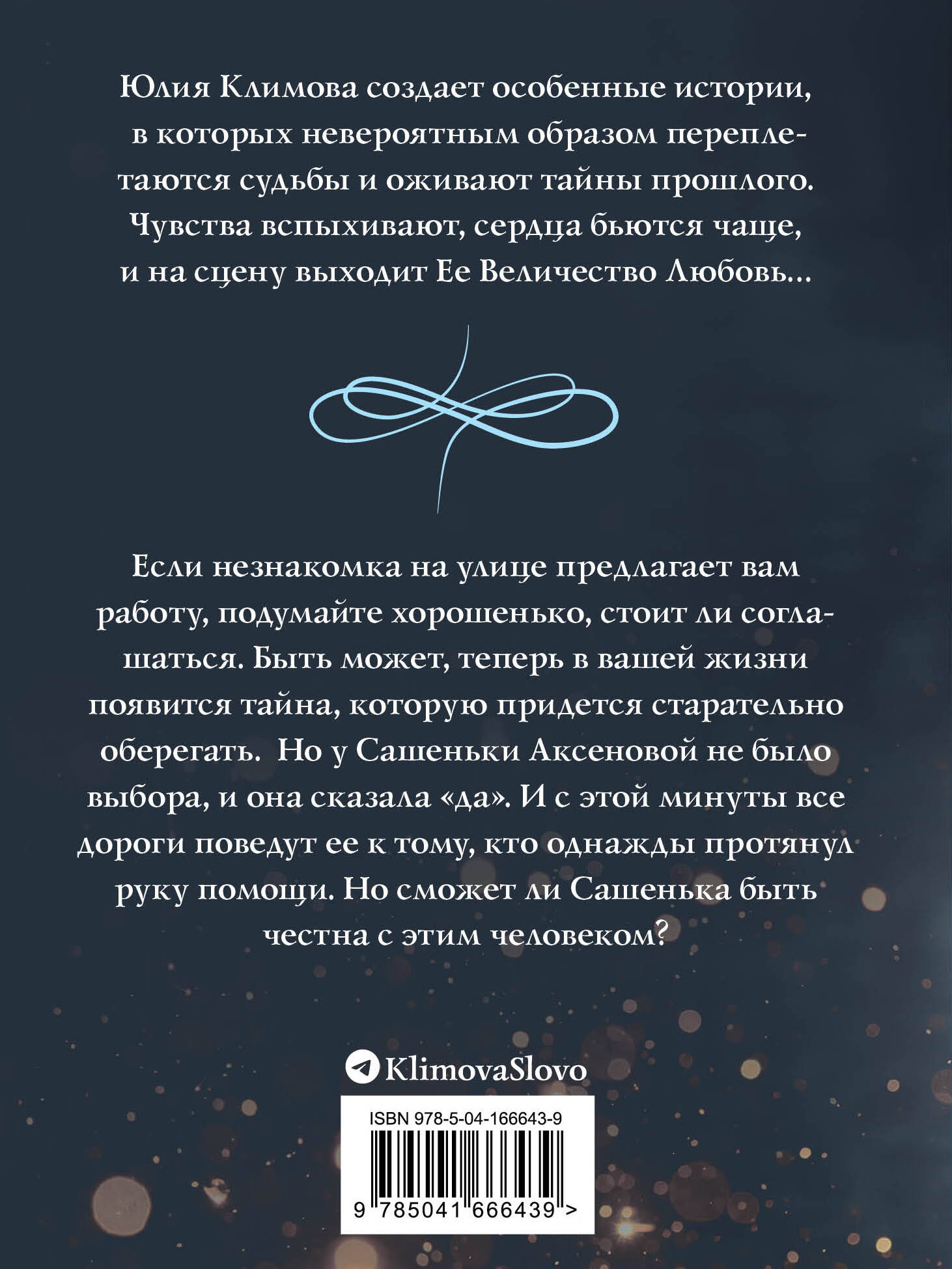 Истории Юлии Климовой - самые уютные и добрые романы о любви. Если незнакомка на улице предлагает вам работу, подумайте хорошенько, стоит ли соглашаться. Быть может, теперь в вашей жизни появится тайна, которую придется старательно оберегать. Но у Сашеньки Аксеновой не было выбора, и она сказала «да». И с этой минуты все дороги поведут ее к тому, кто однажды протянул руку помощи. Но сможет ли Сашенька быть честна с этим человеком?| Издательство | Эксмо |
