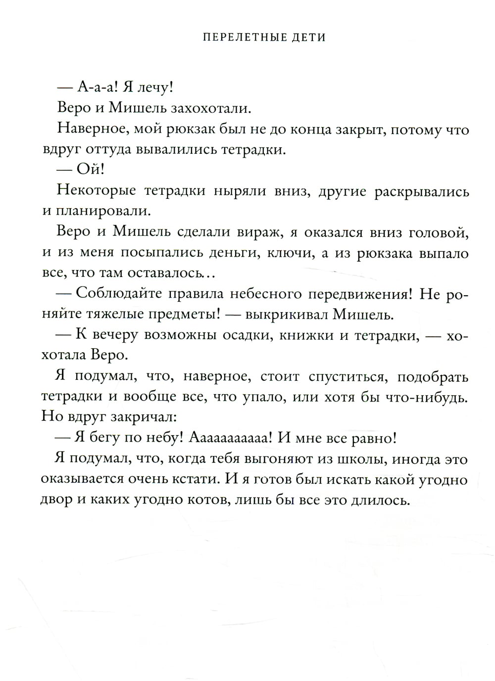 Воро и Мишель из страны Там прилетают в Москву, чтобы найти здесь дом своей бабушки адреса, но... с тремя березами, рыжим котом и колоритным дворником. Задача не из легких, однако Веро, Мишель и присоединившегося к ним Дрю (кстати, он москвич) не пугают никакие трудности. Ребята летают по Москве, встречая на своем пути самых неожиданных персонажей: постового, мечтающего стать дирижером, водителя троллейбуса, предпочитающего гонять по улицам без проводов, странную, забывчивую и очень одинокую старушку, скучающие памятники и даже крокодилов, комфортно обитающих в Москве-реке... Книга "Перелётные дети" - удивительное переплетение снов и реальности, сказочная путаница на фоне старой Москвы.| Издательство | Абрикобукс |