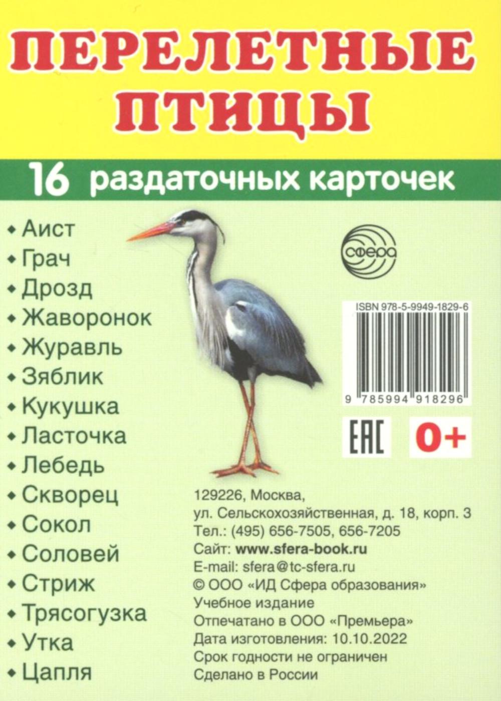 16 раздаточных карточек размером 63х87 мм для познавательного и речевого развития. На обороте каждой карточки - название перелетных птиц на русском и английском языках. 1. Аист 2. Грач 3. Дрозд 4. Жаворонок 5. Журавль 6. Зяблик 7. Кукушка 8. Ласточка 9. Лебедь 10. Скворец 11. Сокол 12. Соловей 13. Стриж 14. Трясогузка 15. Утка 16. Цапля.| Издательство | Творческий центр Сфера |