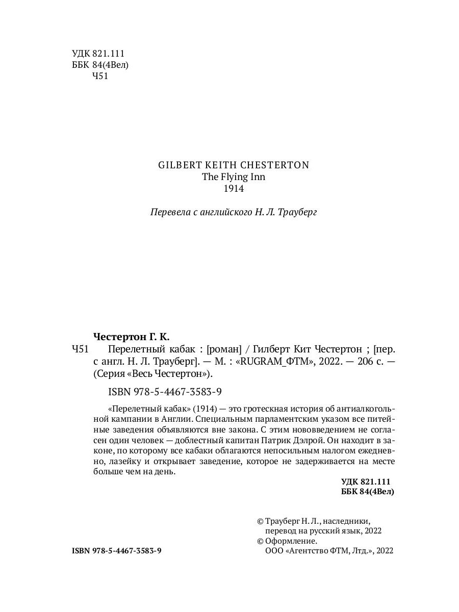Гротескный роман Г. К. Честертона (1874-1936) об антиалкогольной кампании в Англии, когда парламентским указом все питейные заведения были объявлены вне закона. Капитан Патрик Дэлрой находит в законе лазейку и открывает кабак.