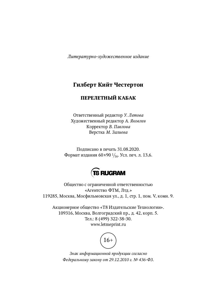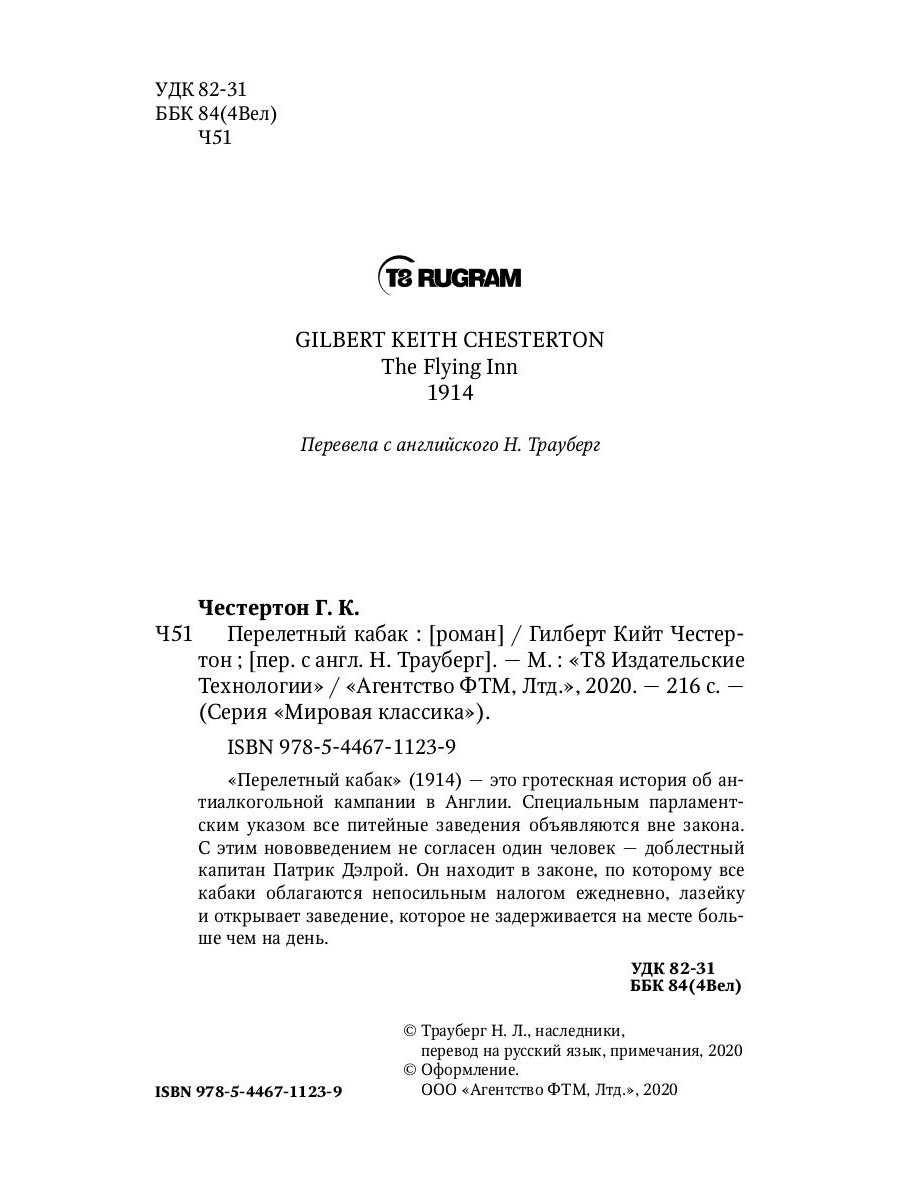 «Перелетный кабак» (1914) - это гротескная история об антиалкогольной кампании в Англии. Специальным парламентским указом все питейные заведения объявляются вне закона. С этим нововведением не согласен один человек - доблестный капитан Патрик Дэлрой. Он находит в законе, по которому все кабаки облагаются непосильным налогом ежедневно, лазейку и открывает заведение, которое не задерживается на месте больше чем на день.| Издательство | Т8 RUGRAM |