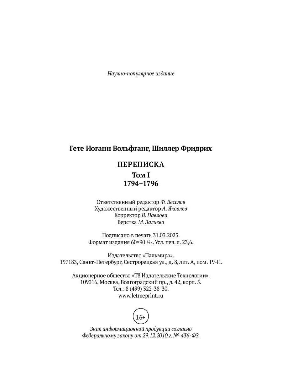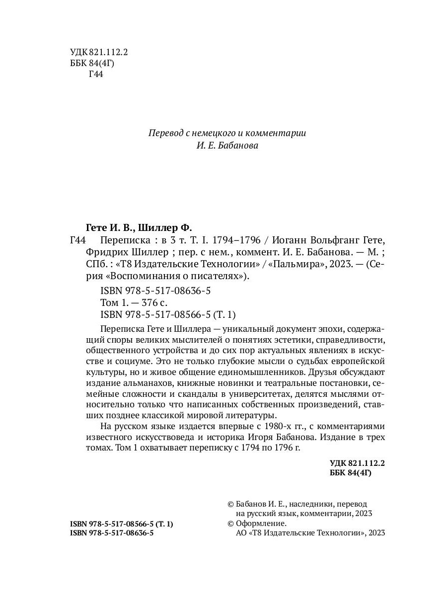 Свод писем, которыми обменялись выдающиеся немецкие поэты И. В. Гёте (1749-1832) и Ф. Шиллер (1759-1805) в 1794-1805 гг., представляет собой целостный и уникальный памятник мировой литературы. "Переписка Гёте и Шиллера" в полном объеме была опубликована на русском языке впервые в конце 1980-х годов. Первый том охватывает переписку 1794-1796 гг.