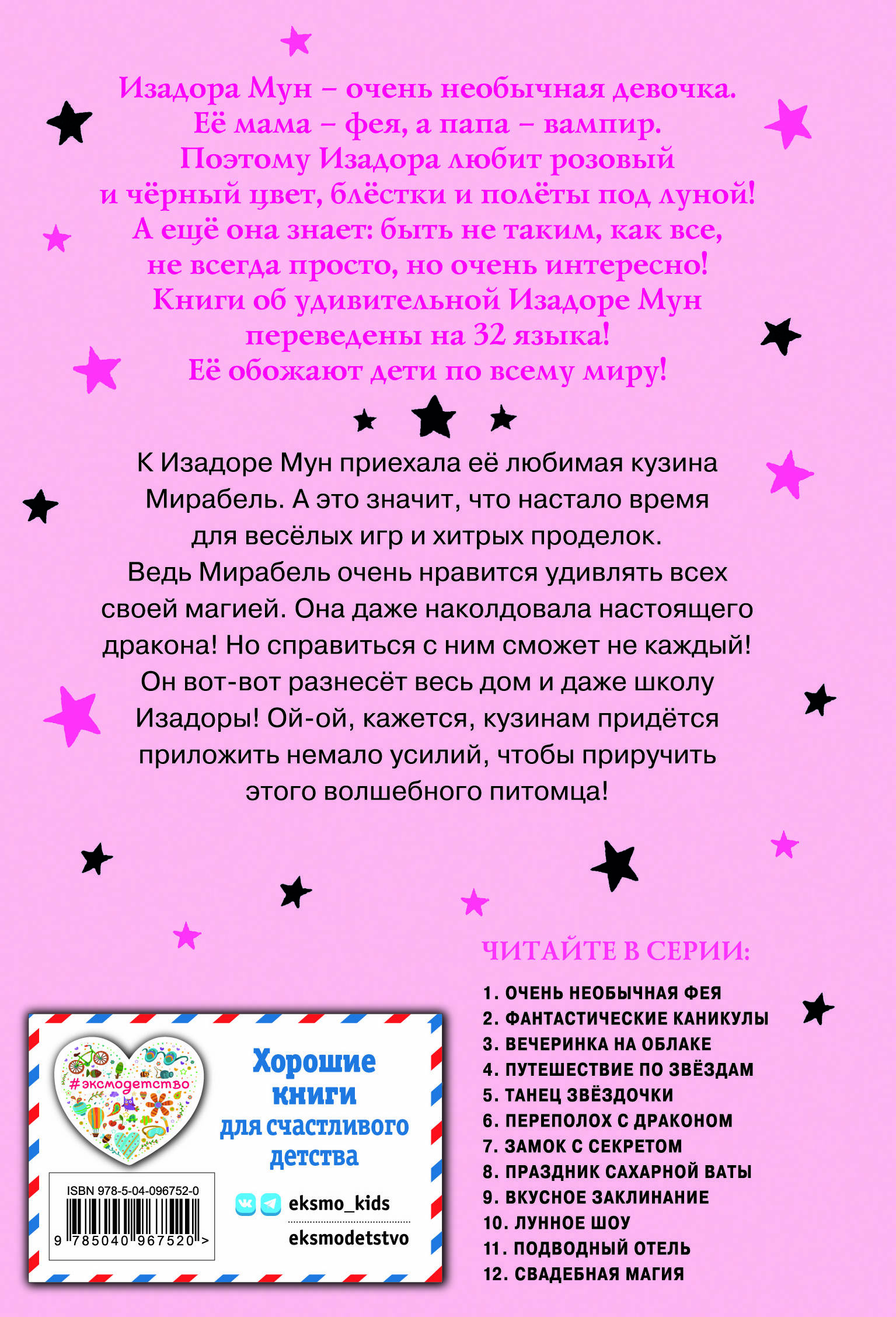 Когда к Изадоре приезжает её кузина Мирабель, в доме начинается безумное веселье! Ведь Мирабель владеет магией и обожает устраивать хитрые проделки. Например, в этот раз она решила наколдовать для Изадоры живого дракончика! Правда, дракончик-малыш начал расти не по дням, а по часам. Ещё немного, и он устроит грандиозный переполох! Что же теперь делать Изадоре? Получится ли у неё приручить нового питомца? Гарриет Манкастер - всемирно известная писательница и иллюстратор, книги которой переведены на 27 языков! Изадора Мун - феномен во всем мире! Эта маленькая девочка не просто героиня книги, а настоящий символ того, что каждый из нас может быть уникальным и неповторимым! Вырастить своего собственного дракончика и полетать на нем - с Изадорой это возможно! Внутри книги - яркие черно-розовые иллюстрации. Книги блестят и переливаются! Формат специально разработан так, чтобы маленькому читателю было удобно.| Издательство | ООО "Издательство "Эксмо" |