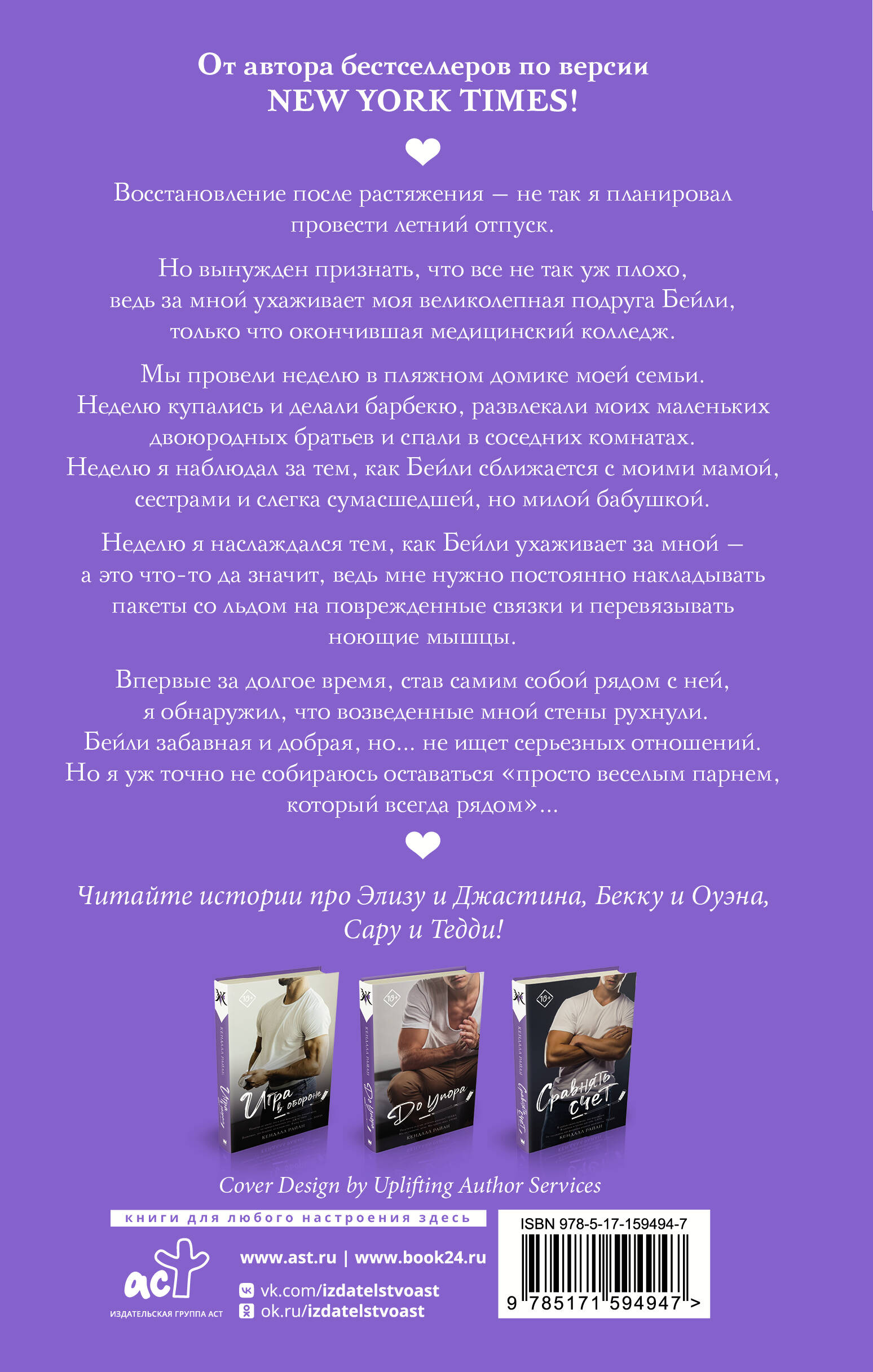 Восстановление после растяжения - не так я планировал провести летний отпуск. Но вынужден признать, что все не так уж плохо, ведь за мной ухаживает моя великолепная подруга Бейли, только что окончившая медицинский колледж. Мы провели неделю в пляжном домике моей семьи. Неделю купались и делали барбекю, развлекали моих маленьких двоюродных братьев и спали в соседних комнатах. Неделю я наблюдал за тем, как Бейли сближается с моими мамой, сестрами и слегка сумасшедшей, но милой бабушкой. Неделю я наслаждался тем, как Бейли ухаживает за мной - а это что-то да значит, ведь мне нужно постоянно накладывать пакеты со льдом на поврежденные связки и перевязывать ноющие мышцы. Впервые за долгое время, став самим собой рядом с ней, я обнаружил, что возведенные мной стены рухнули. Бейли забавная и добрая, но… не ищет серьезных отношений. Но я уж точно не собираюсь оставаться "просто веселым парнем, который всегда рядом"...