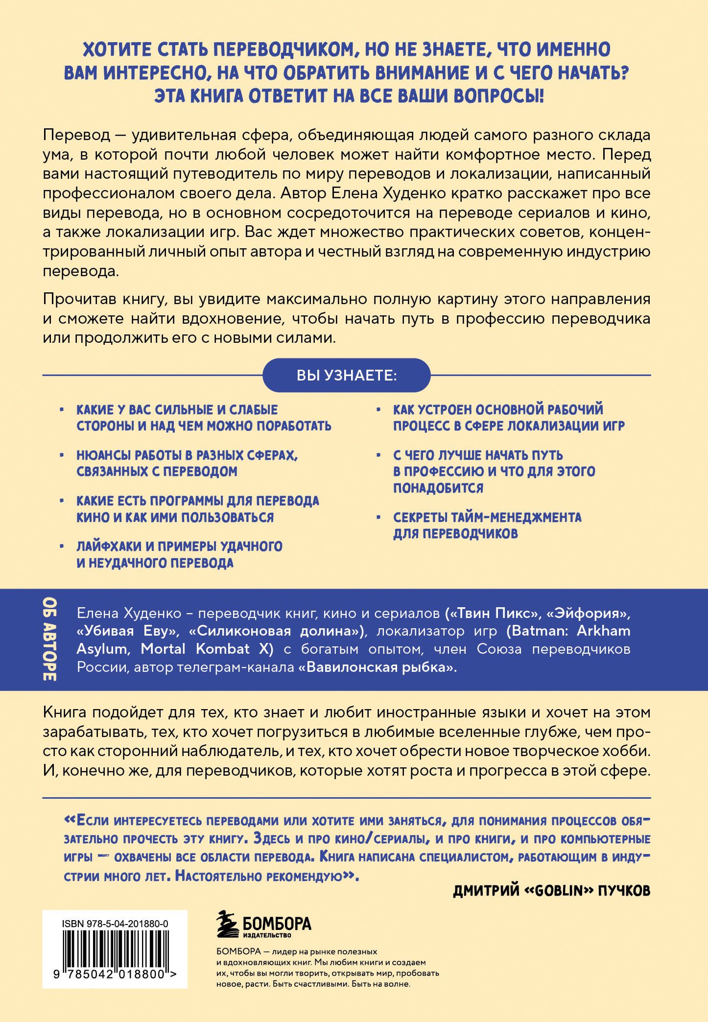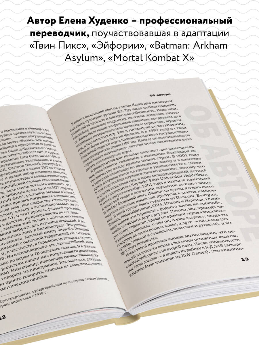 ХОТИТЕ СТАТЬ ПЕРЕВОДЧИКОМ, НО НЕ ЗНАЕТЕ, ЧТО ИМЕННО ВАМ ИНТЕРЕСНО, НА ЧТО ОБРАТИТЬ ВНИМАНИЕ И С ЧЕГО НАЧАТЬ? ЭТА КНИГА ОТВЕТИТ НА ВСЕ ВАШИ ВОПРОСЫ! Перевод - удивительная сфера, объединяющая людей самого разного склада ума, в которой почти любой человек может найти комфортное место. Перед вами настоящий путеводитель по миру переводов и локализации, написанный профессионалом своего дела. Автор Елена Худенко кратко расскажет про все виды перевода, но в основном сосредоточится на переводе сериалов и кино, а также локализации игр. Вас ждет множество практических советов, концентрированный личный опыт автора и честный взгляд на современную индустрию перевода. Прочитав книгу, вы увидите максимально полную картину этого направления и сможете найти вдохновение, чтобы начать путь в профессию переводчика или продолжить его с новыми силами. Вы узнаете: • Какие у вас сильные и слабые стороны и над чем можно поработать. • Нюансы работы в разных сферах, связанных с переводом. • Какие есть программы для перевода кино и как ими пользоваться. • Лайфхаки и примеры удачного и неудачного перевода. • Как устроен основной рабочий процесс в сфере локализации игр. • С чего лучше начать путь в профессию и что для этого понадобится. • Секреты тайм-менеджмента для переводчиков. Книга подойдет для тех, кто знает и любит иностранные языки и хочет на этом зарабатывать, тех, кто хочет погрузиться в любимые вселенные глубже, чем просто как сторонний наблюдатель, и тех, кто хочет обрести новое творческое хобби. И, конечно же, для переводчиков, которые хотят роста и прогресса в этой сфере. Об авторе Елена Худенко - переводчик книг, кино и сериалов («Твин Пикс», «Эйфория», «Убивая Еву», «Силиконовая долина»), локализатор игр (Batman: Arkham Asylum, Mortal Kombat X) с богатым опытом, член Союза переводчиков России, автор телеграм-канала «Вавилонская рыбка». «Если интересуетесь переводами или хотите ими заняться, для понимания процессов обязательно прочесть эту книгу. Здесь и про кино/сериалы, и про книги, и про компьютерные игры - охвачены все области перевода. Книга написана специалистом, работающим в индустрии много лет. Настоятельно рекомендую». - Дмитрий «Goblin» Пучков