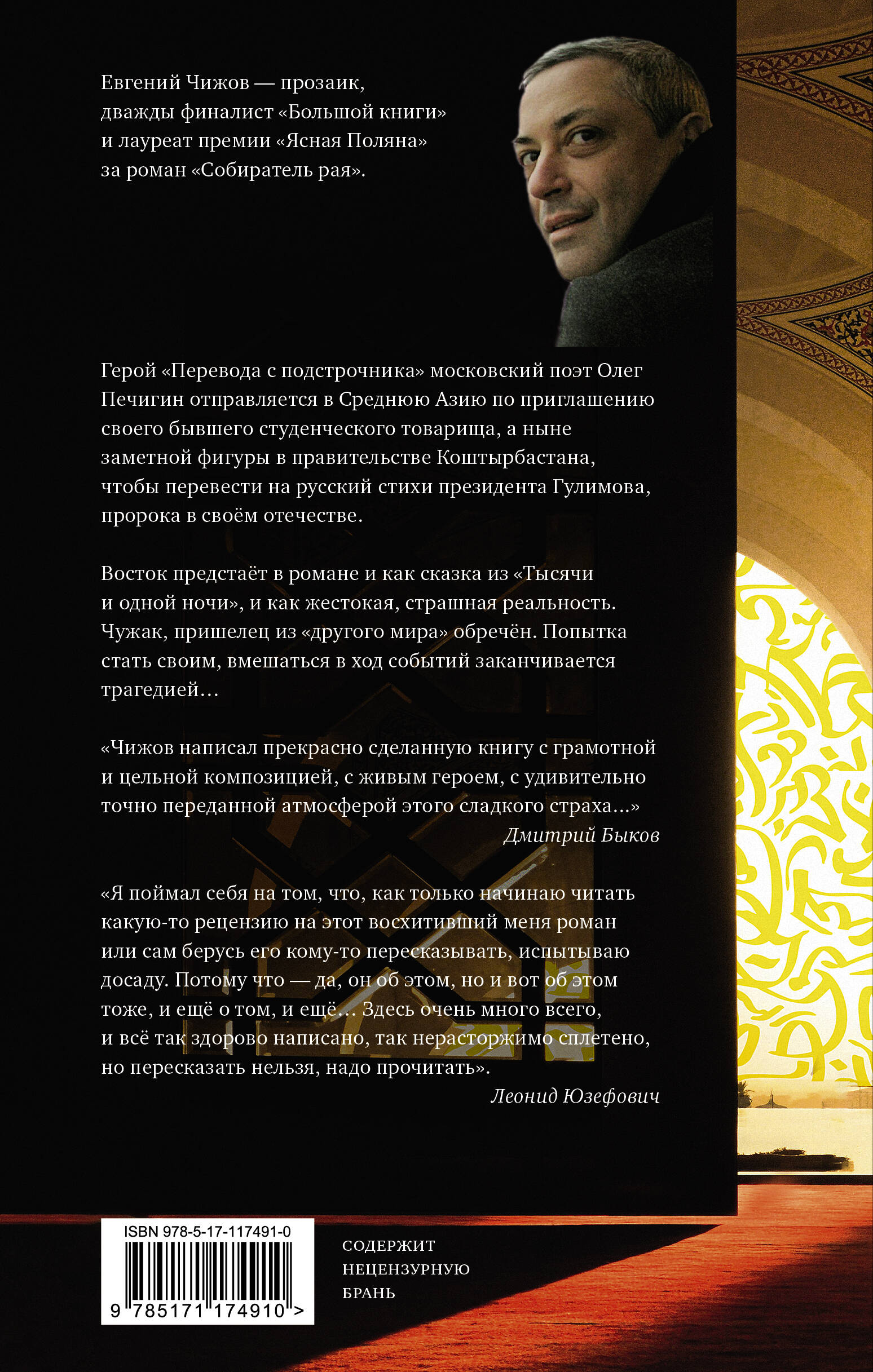 Евгений Чижов - прозаик, дважды финалист "Большой книги" и лауреат премии "Ясная Поляна" за роман "Собиратель рая". Герой "Перевода с подстрочника" московский поэт Олег Печигин отправляется в Среднюю Азию по приглашению своего бывшего студенческого товарища, а ныне заметной фигуры в правительстве Коштырбастана, дабы перевести на русский стихи президента Гулимова, пророка в своем отечестве. Восток предстает в романе и как сказка из "Тысячи и одной ночи", и как жестокая, страшная реальность. Чужак, пришелец из другого мира обречен. Попытка стать своим, вмешаться в ход событий заканчивается трагедией… Может ли поэт находиться у власти? А возглавлять государство? И каким будет государство, во главе которого стоит поэт? "Перевод с подстрочника" не просто о путешествии на Восток, но о погружении в иное мирочувствование, противоположное европейской рациональности. О "проклятом поэте" на вершине властной пирамиды; о пророке, командующем танковыми дивизиями. Наконец, о поиске чуда и вдохновения, встреча с которыми несёт гибель. "Лучший и, безусловно, самый актуальный русский роман последних лет". Галина Юзефович "Я поймал себя на том, что, как только начинаю читать какую-то рецензию на этот восхитивший меня роман или сам берусь его кому-то пересказывать, испытываю досаду. Потому что - да, он об этом, но и вот об этом тоже, и ещё о том, и ещё… Здесь очень много всего, и всё так здорово написано, так нерасторжимо сплетено, но пересказать нельзя, надо прочитать". Леонид Юзефович| Издательство | Издательство "АСТ" |