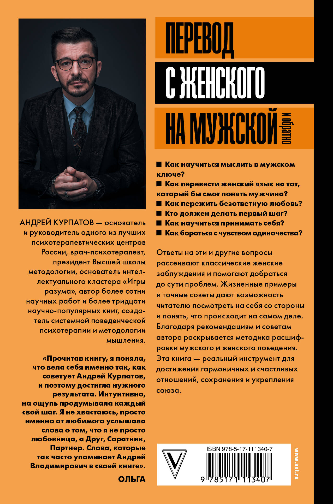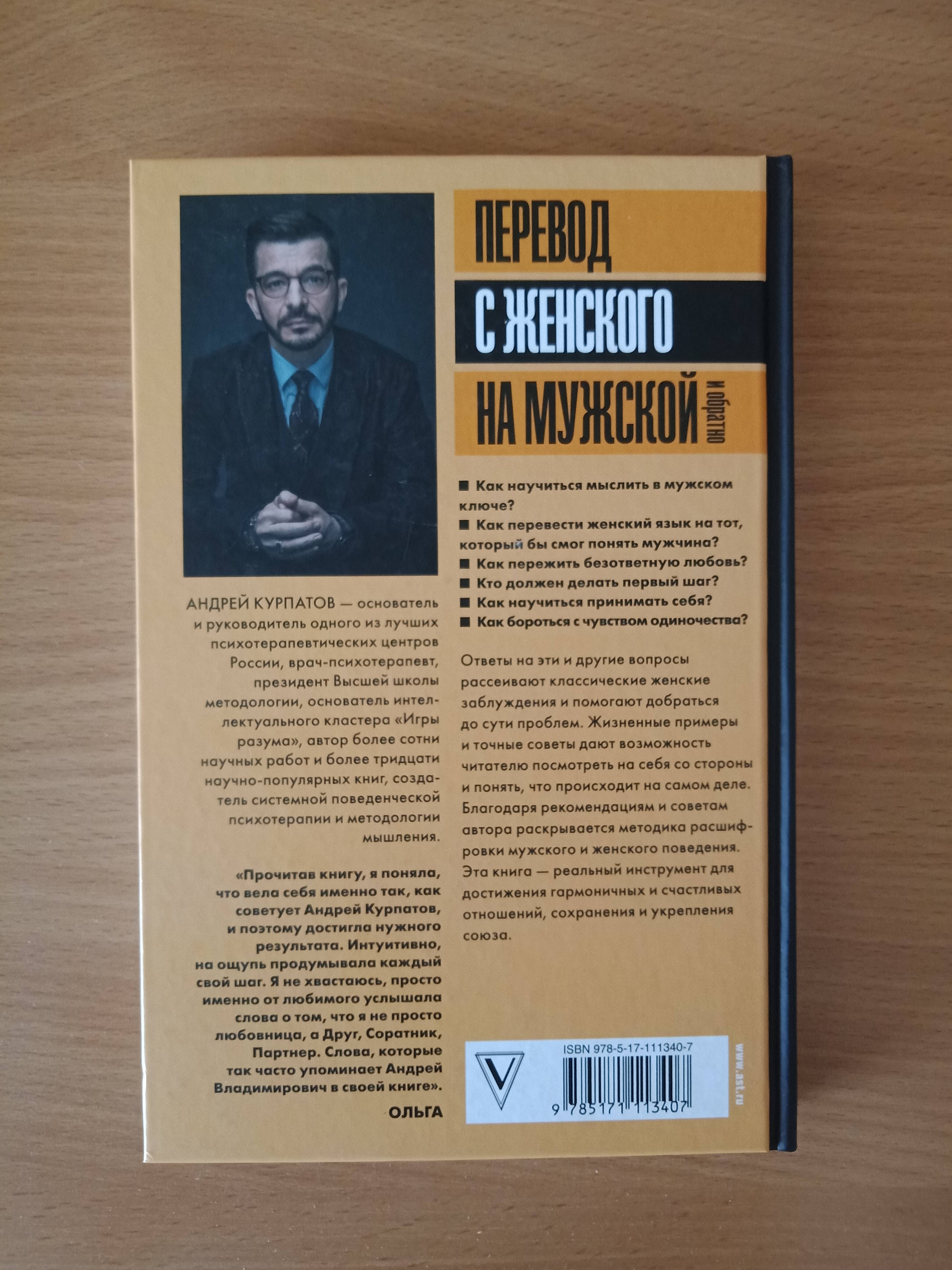 Андрей Курпатов - основатель и руководитель одного из лучших психотерапевтических центров России, врач-психотерапевт, президент Высшей школы методологии. Автор более тридцати научно-популярных книг, замечательных бестселлеров, посвященных различным аспектам поведения человека, его книги изданы на восьми языках общим тиражом более пяти миллионов экземпляров. Автор и ведущий телевизионных программ на Первом канале и на телеканале "Домашний" - "Доктор Курпатов" и "Все решим с доктором Курпатовым". Как научиться мыслить в мужском ключе? Как перевести женский язык на тот, который бы смог понять мужчина? Как пережить безответную любовь? Кто должен делать первый шаг? Как научиться принимать себя? Как бороться с чувством одиночества? Ответы на эти и другие вопросы рассеивают классические женские заблуждения и помогают добраться до сути проблем. Жизненные примеры и точные советы дают возможность читателю посмотреть на себя со стороны и понять, что происходит на самом деле. Благодаря рекомендациям и советам автора раскрывается методика расшифровки мужского и женского поведения. Эта книга - реальный инструмент для достижения гармоничных и счастливых отношений, сохранения и укрепления союза.| Издательство | Издательство "АСТ" |