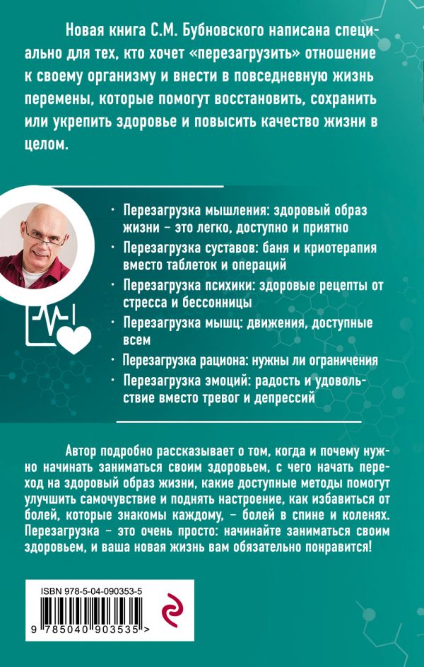 Новая книга известного врача-кинезитерапевта, автора системы оздоровления без лекарств и операций, доктора медицинских наук, профессора С.М. Бубновского написана специально для тех, кто хочет "перезагрузить" отношение к своему организму и внести в повседневную жизнь перемены, которые помогут восстановить, сохранить или укрепить здоровье и повысить качество жизни в целом. Автор подробно рассказывает о том, когда и почему нужно начинать заниматься своим здоровьем, с чего начать переход на здоровый образ жизни, какие доступные методы помогут улучшить самочувствие и поднять настроение, как избавиться от болей, которые знакомы каждому - болей в спине и коленях. "Перезагрузка" - это очень просто: начинайте заниматься своим здоровьем, и ваша новая жизнь вам обязательно понравится!