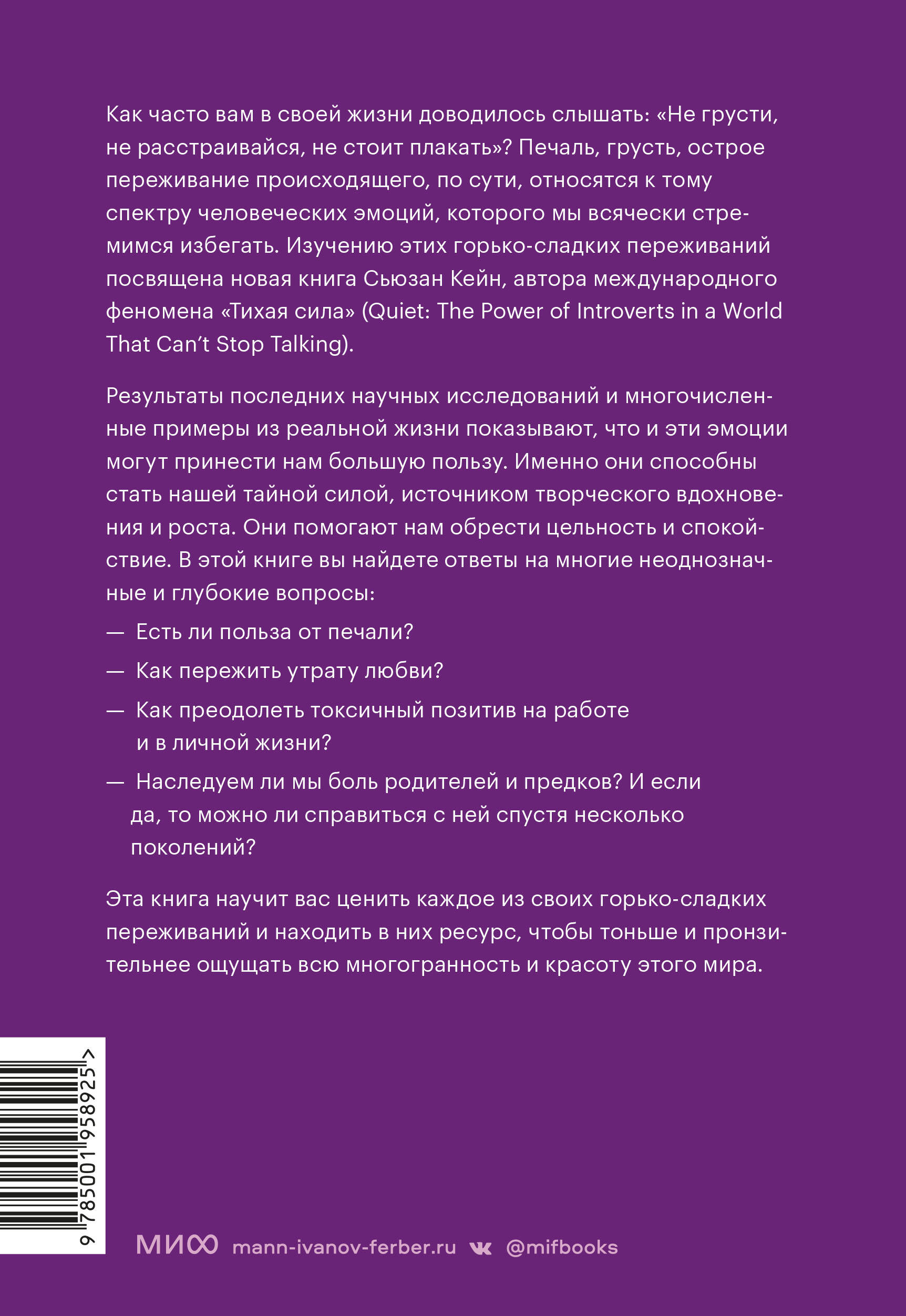 Печаль, грусть, боль - чувства, которых мы часто стараемся избегать. Но Сьюзан Кейн уверена: именно они способны стать нашей тайной силой. Эта пронзительная и глубокая книга поможет принять и прожить эмоции. Она возвращает читателю право на сложные негативные чувства и снимает с них стигму, а также поможет пережить непростые времена и придаст сил.| Издательство | МАНН, ИВАНОВ И ФЕРБЕР ООО |