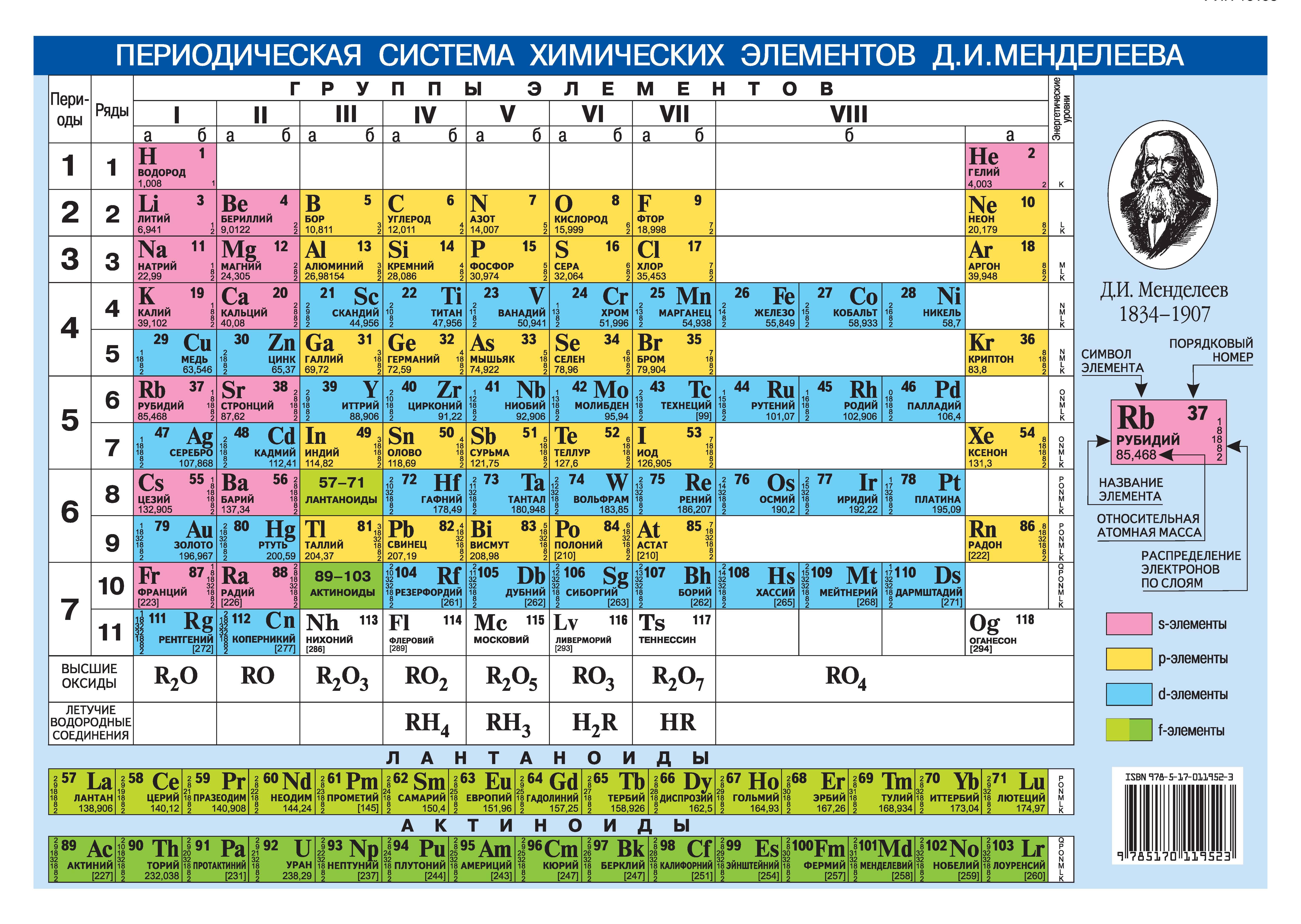Аннотация: Периодическая система химических элементов Д.И. Менделеева. + Растворимость кислот, оснований и солей в воде