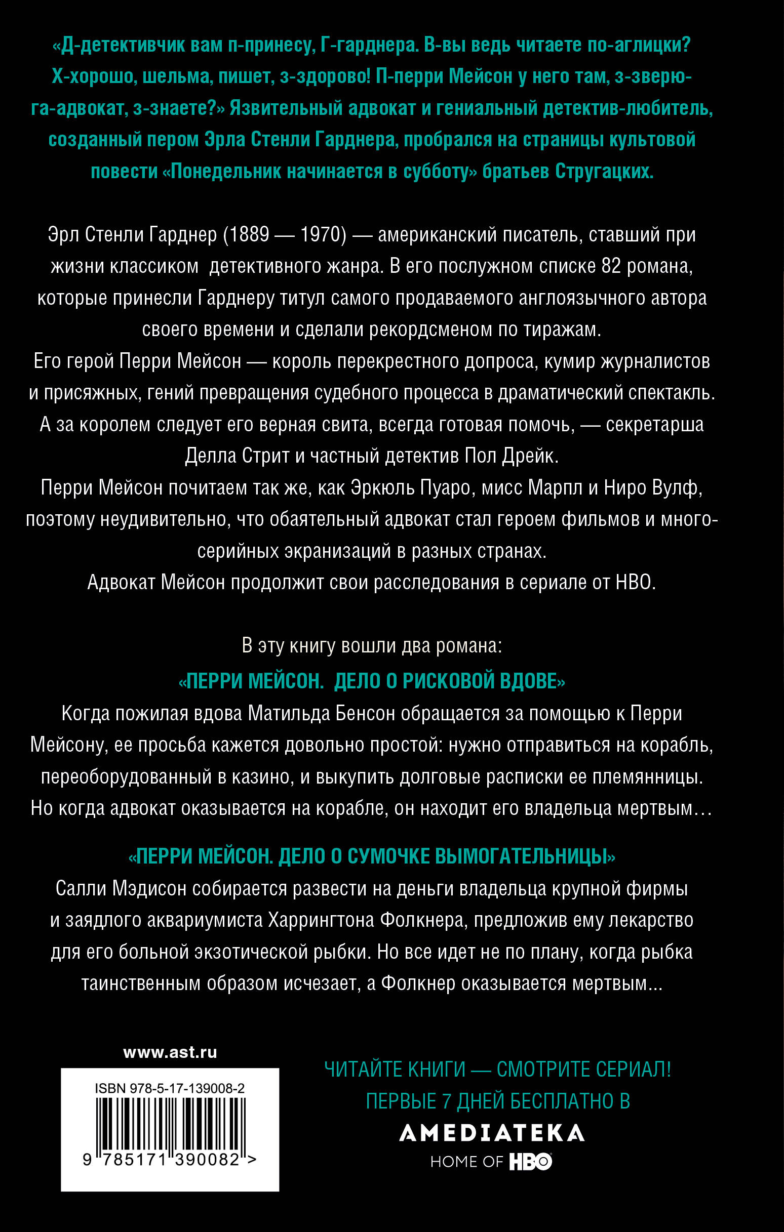 Дело о рисковой вдове Когда пожилая вдова Матильда Бенсон обращается за помощью к Перри Мейсону, ее просьба кажется довольно простой: нужно отправиться на корабль, переоборудованный в казино, и выкупить долговые расписки ее племянницы. Но когда адвокат оказывается на корабле, он находит его владельца мертвым… Дело о сумочке вымогательницы Салли Мэдисон собирается развести на деньги владельца крупной фирмы и заядлого аквариумиста Харрингтона Фолкнера, предложив ему лекарство для его больной экзотической рыбки. Но все идет не по плану, когда рыбка таинственным образом исчезает, а Фолкнер оказывается мертвым...| Издательство | ИЗДАТЕЛЬСТВО "АСТ" |