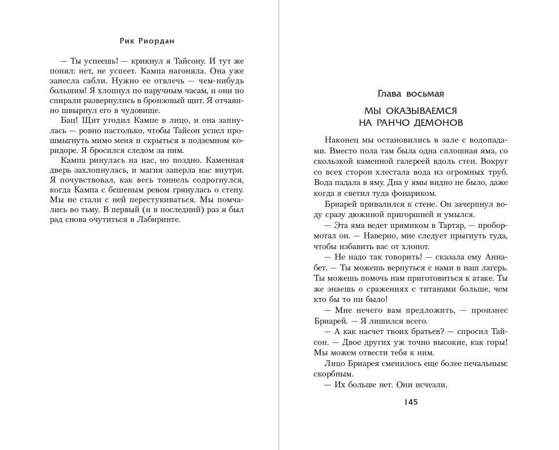 Цикл о Перси Джексоне принес своему автору мировую известность. Сегодня по произведениям Рика Риордана снимаются фильмы, а суммарные продажи его книг превысили 100 миллионов экземпляров. Лука, сын Гермеса и злейший враг Перси, стал верным приспешником титана Кроноса. И теперь ждет, когда его страшный повелитель воскреснет целиком и полностью. Собрав себя заново, Кронос уничтожит лагерь Полукровок. А потом бросит армию на штурм Олимпа… И, чтобы сорвать его планы, нужно совершить подвиг. Аннабет Чейз, Перси Джексон и их друзья направляются в Лабиринт, созданный когда-то Дедалом. Это темное и опасное место, полное тайн и чудовищ. Тот, кто подчинит Лабиринт своей воле, сможет быстро и безопасно перенестись в любую точку пространства. Друзья должны опередить Луку и раскрыть тайну Лабиринта - иначе в предстоящей битве у них не будет шансов на победу. Это четвертая книга о Перси Джексоне. Это темное и опасное место, полное тайн и чудовищ. От того, сумеют ли друзья пройти его, опередив Луку, зависят победа в грядущей войне... и их жизни.