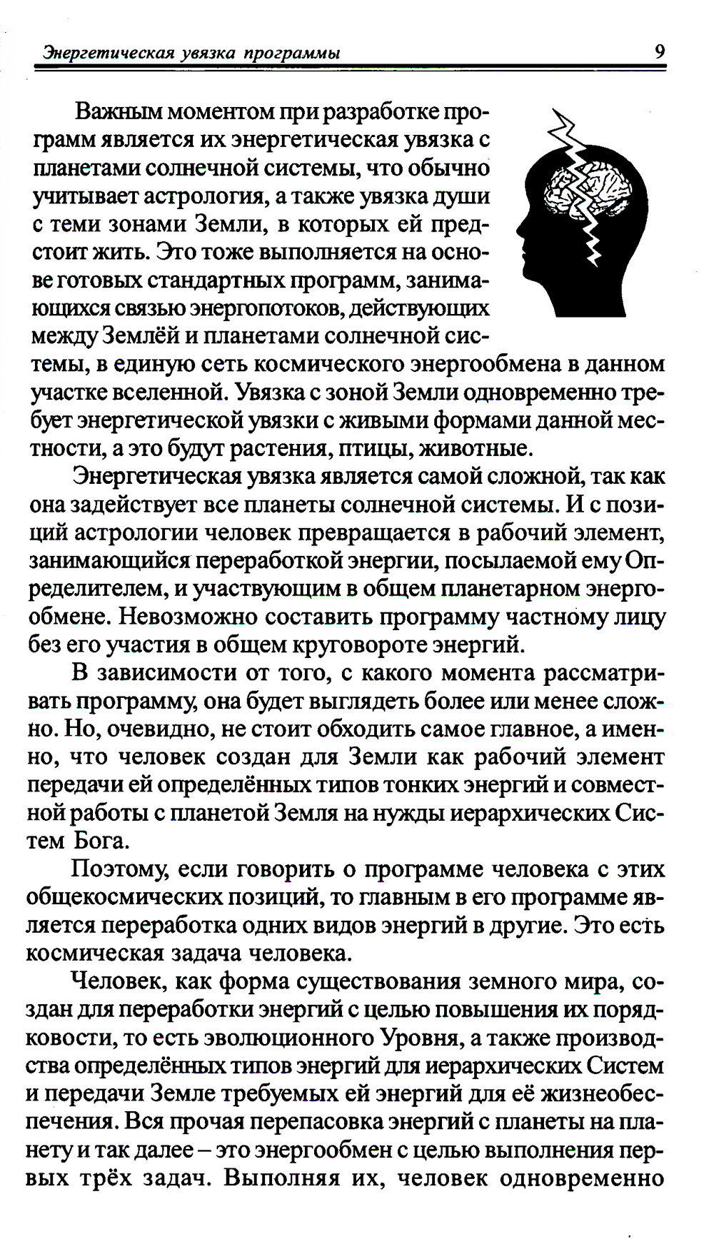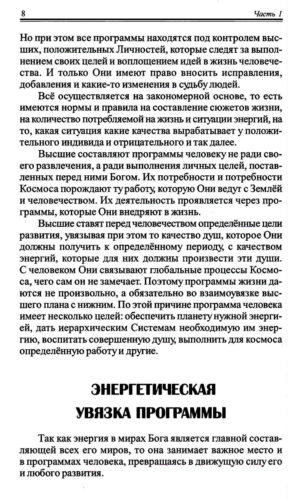 Книга знакомит читателя с построением программы жизни человека и особенностями формирования Высшими Силами его Судьбы. Раскрываются тайны записи программ на тонких оболочках души, тайны управления программами временем и построения голографических ситуаций жизни. Книга повествует об энергетических особенностях архитектуры зданий, о загадках ясновидения, вампиризма, посещениях инопланетянами Земли в прошлых цивилизациях и отвечает на рад других вопросов, волнующих читателей.| Издательство | Амрита-Русь |