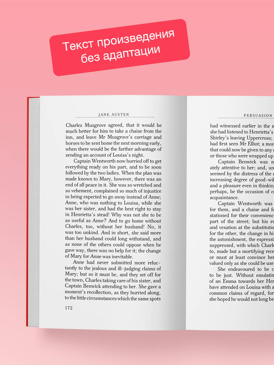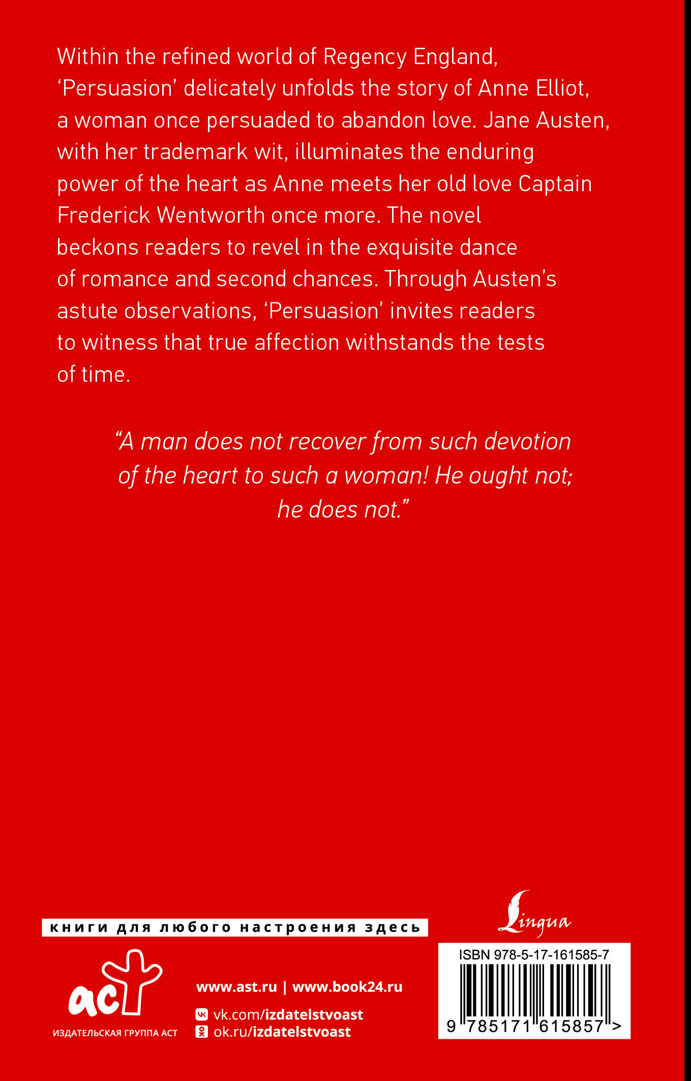 КНИГА НА АНГЛИЙСКОМ ЯЗЫКЕ Предпочитаете учиться у носителей? Тогда у кого же, как не у Джейн Остен? "Persuasion" или "Доводы рассудка" - это последний роман Остен, писательницы, с чьим именем неразрывно связана английская литература. Он рассказывает о судьбе Энн Элиотт, девушки, которая отказалась от помолвки, уступив доводам "мудрых" людей. Через несколько лет она вновь сталкивается с со своим прежним женихом. Прекрасный шанс для неё; но теплится ли ещё любовь в его сердце? Это самый зрелый роман Джейн Остен, достаточно небольшой, чтобы без труда прочесть его. Текст приведен без адаптации и сокращений. Наслаждайтесь изысканной иронией Джейн Остен в оригинале!| Издательство | Издательство "АСТ" |