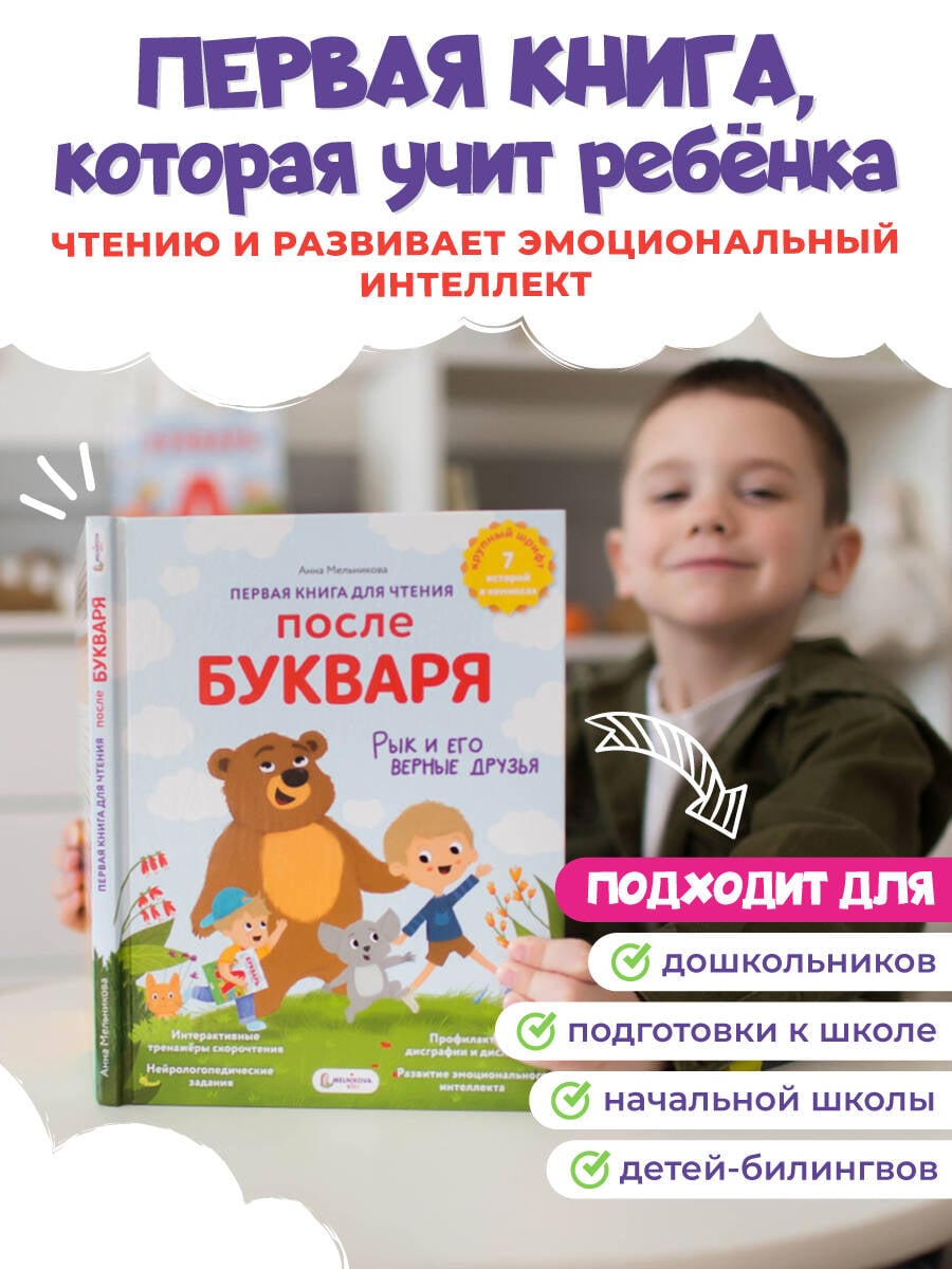 Какой должна быть первая книга для самостоятельного чтения ребёнка? Как сделать чтение любимым занятием? Анна Мельникова, опытный педагог, логопед, основатель школы Kidskey разработала нейропсихологическую методику обучения чтению и на её основе создала уникальную книгу-тренажер по чтению для тех детей, кто уже освоил азбуку и букварь. «Первая книга для чтения после букваря» - это интерактивное пособие с милыми персонажами, красочными комиксами, увлекательными квестами. Специальные задания помогут улучшить технику чтения, увеличить скорость и глубину восприятия текста, пополнить словарный запас, укрепить речевые навыки и развить эмоциональный интеллект. Динамичный сюжет вовлечет ребенка в чтение и сформирует позитивное отношение к занятиям.| Издательство | Издательство "АСТ" |