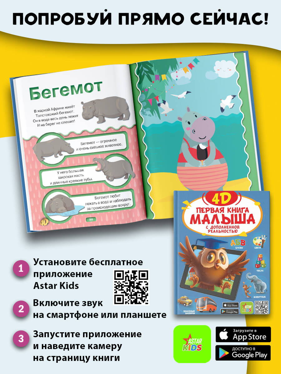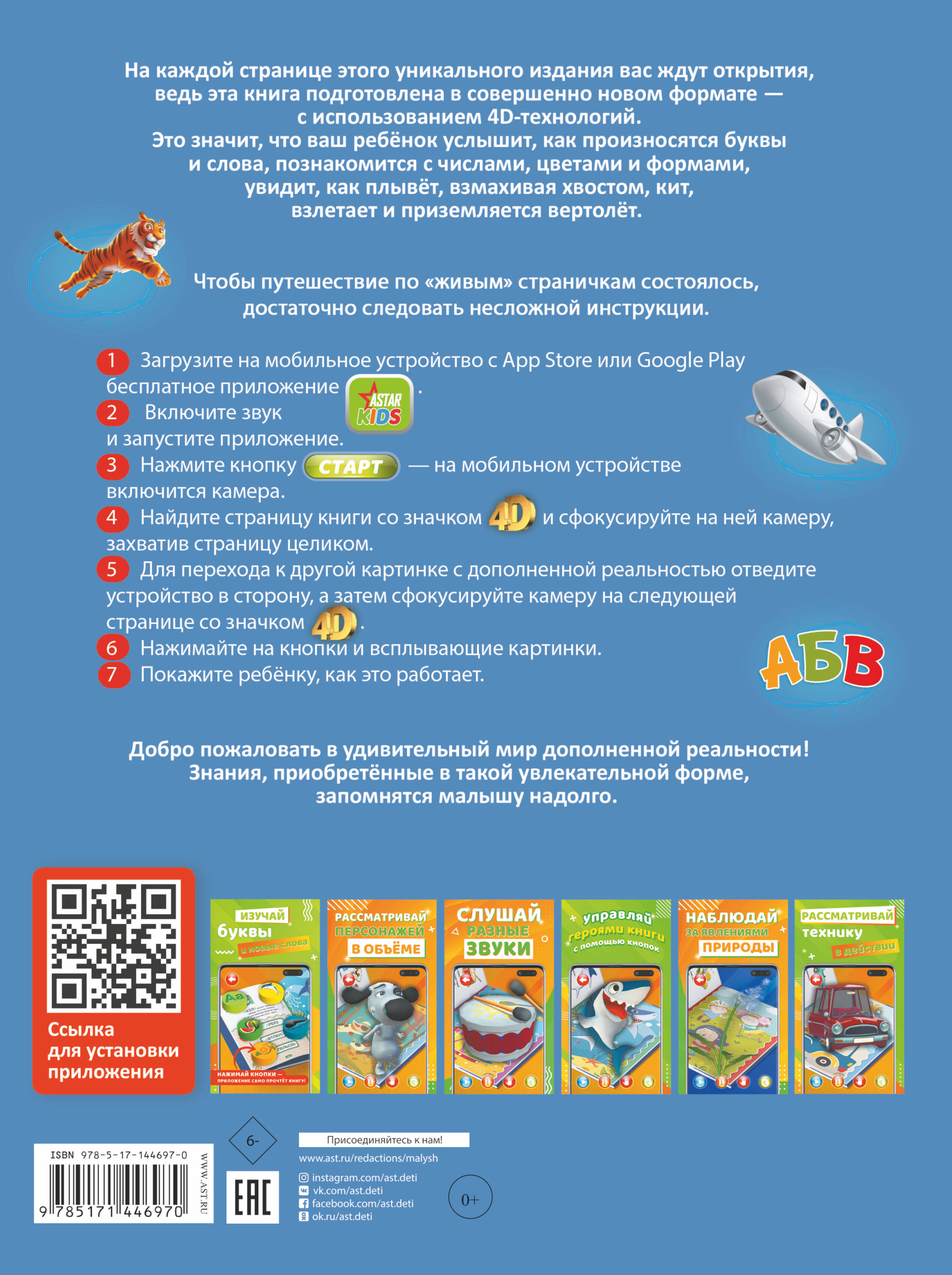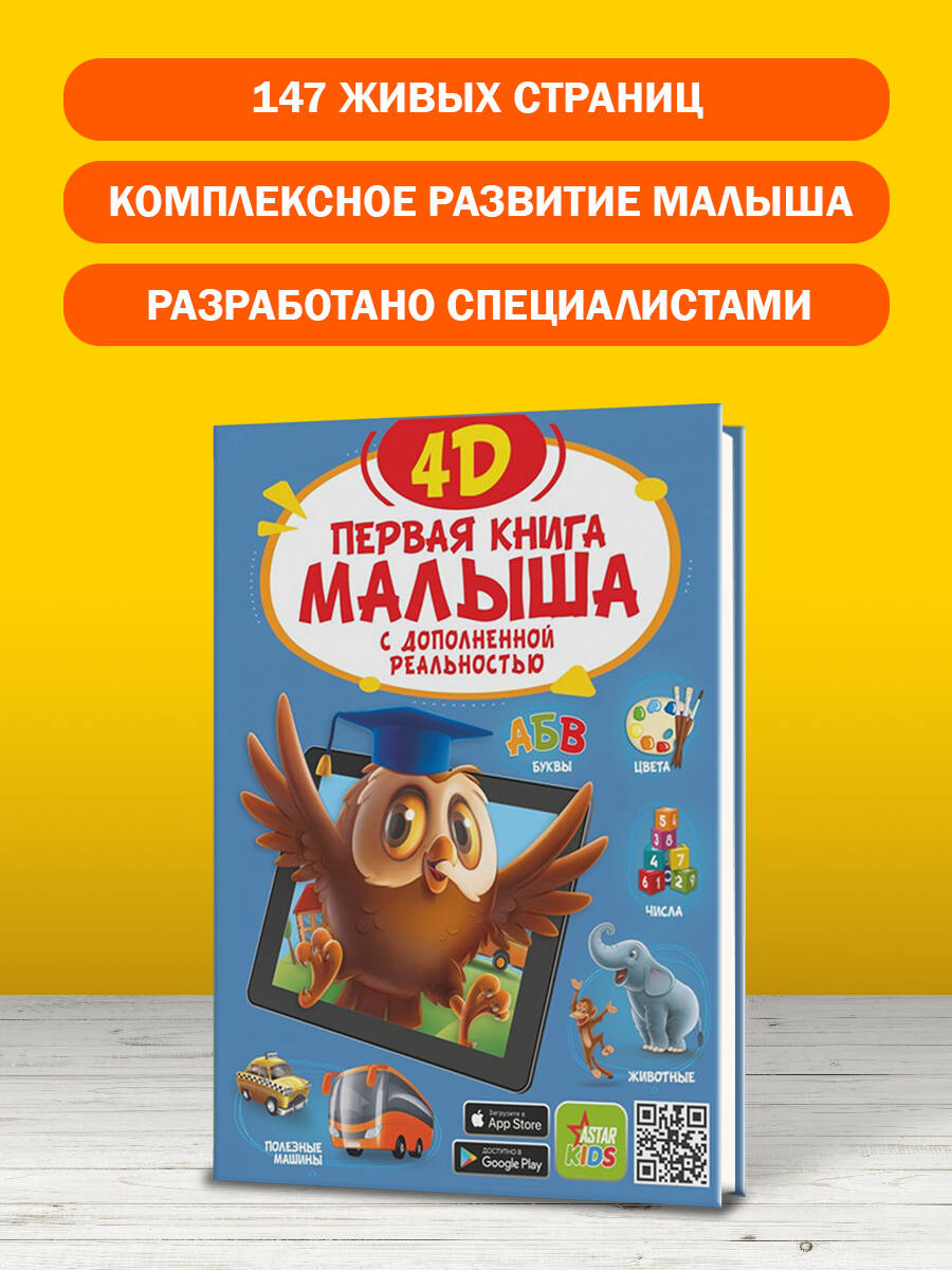 "Первая книга малыша 4D" - уникальное издание, ведь оно подготовлено с использованием дополненной реальности. Достаточно навести на страницу мобильное устройство, и она оживёт: зазвучат буквы и коротенькие рассказы, начнут двигаться звери и машинки. А это значит, что ваш ребёнок сможет заниматься по ней самостоятельно. Нажимая на кнопки и слушая познавательные аудиозаписи, малыш выучит буквы и слова, числа, цвета и формы, познакомится с животным миром и полезными машинами, запомнит весёлые стихотворения. Надеемся, что ребёнок будет познавать окружающий мир с удовольствием, а знания, приобретённые в таком необычном формате, запомнятся ему надолго. Добро пожаловать в мир дополненной реальности! Для дошкольного возраста.| Издательство | ИЗДАТЕЛЬСТВО "АСТ" |